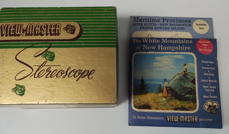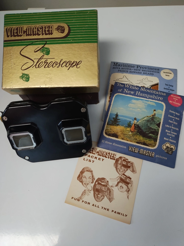 Selling a vintage View-Master Stereoscope! It's in great condition with a minor scratches on the lid. Works with no problem. It comes with the original box and a few reels featuring scenes from the Maritime Provinces and the White Mountains of New Hampshire. A fun piece of nostalgia!