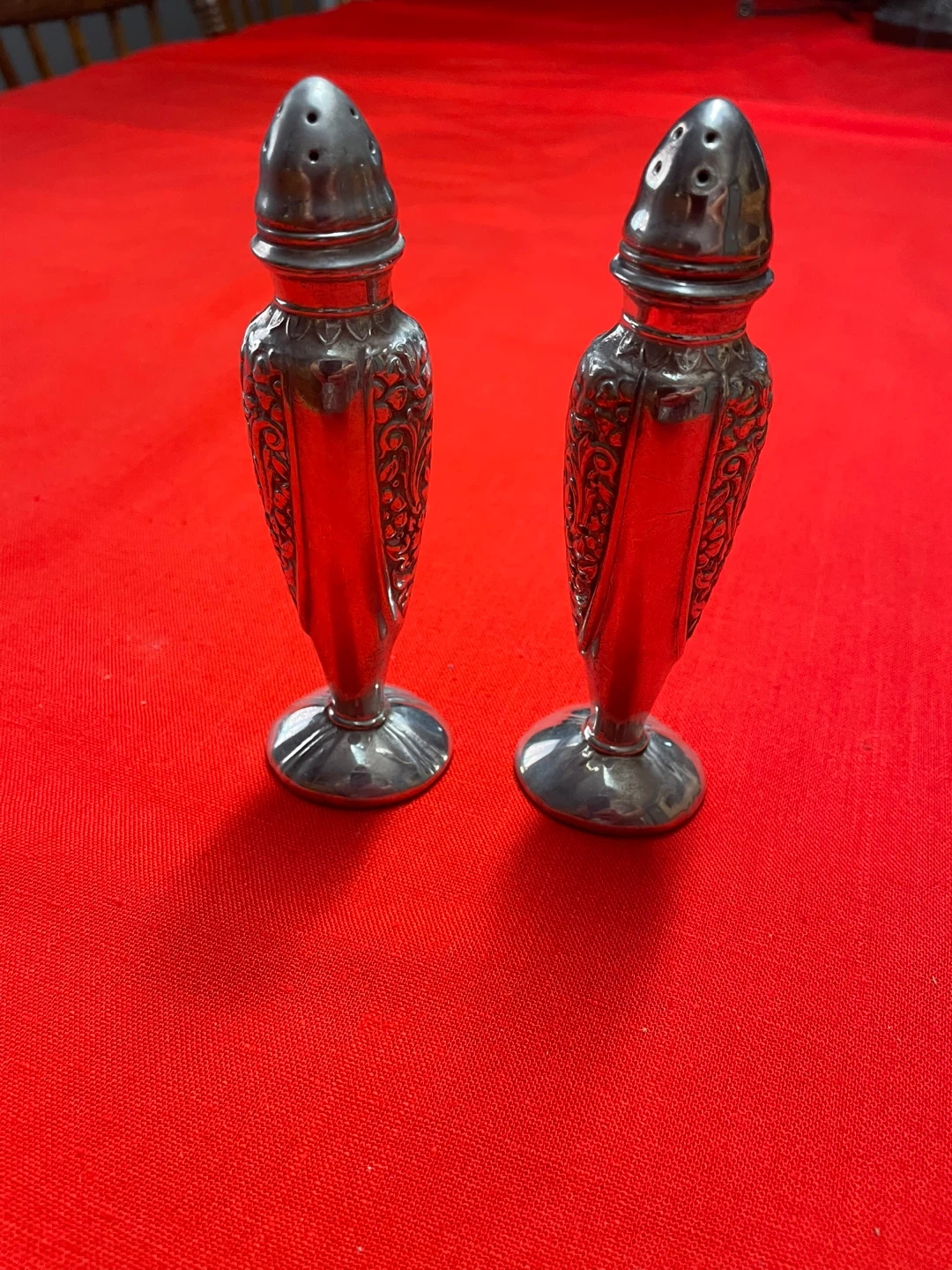 Here's a lovely set of vintage salt and pepper shakers! They're marked "VIKING C18 EP LEAD" on the bottom. The shakers have a beautiful ornate design. They would make a great addition to any dining table!