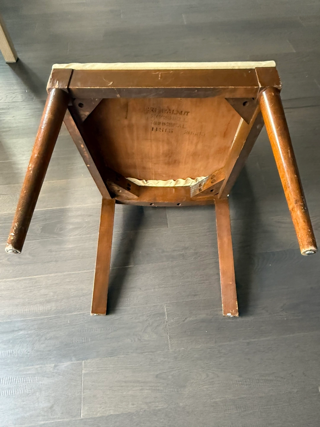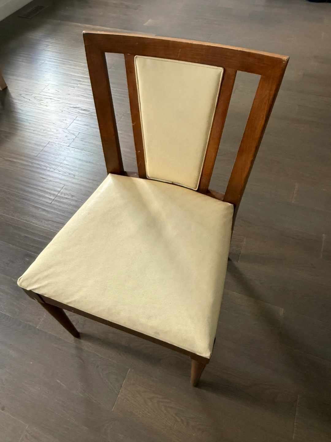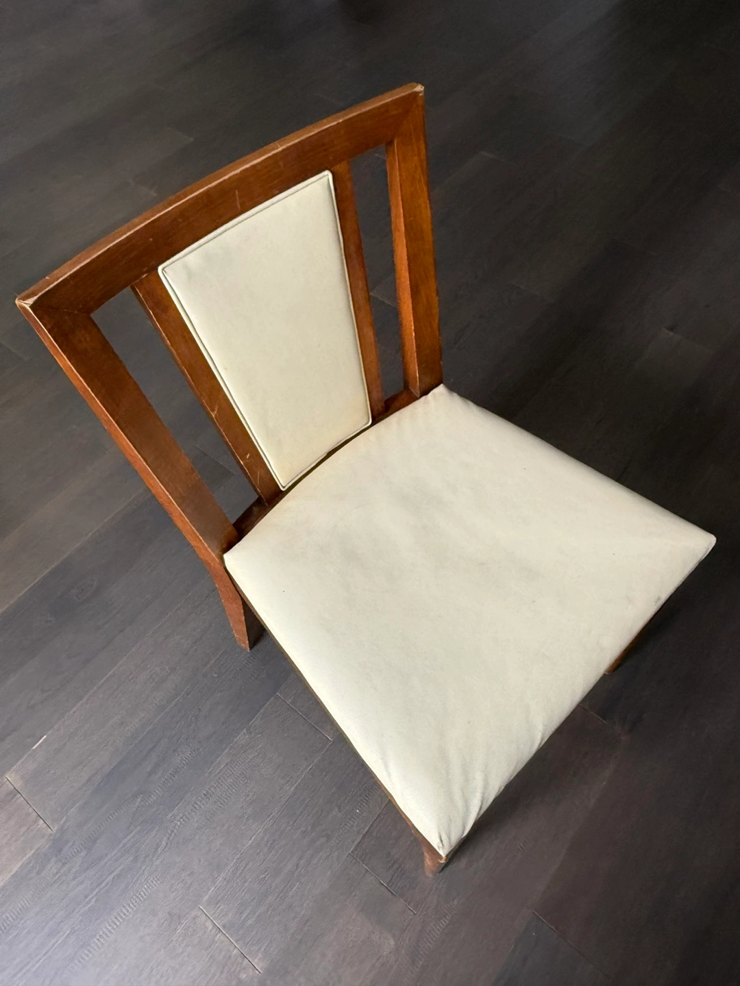 Selling a vintage dining chair with a walnut wood frame and cream-coloured cushioned seat and back. There are some signs of wear and tear, but overall it's a sturdy and stylish piece for your dining space or as an accent chair