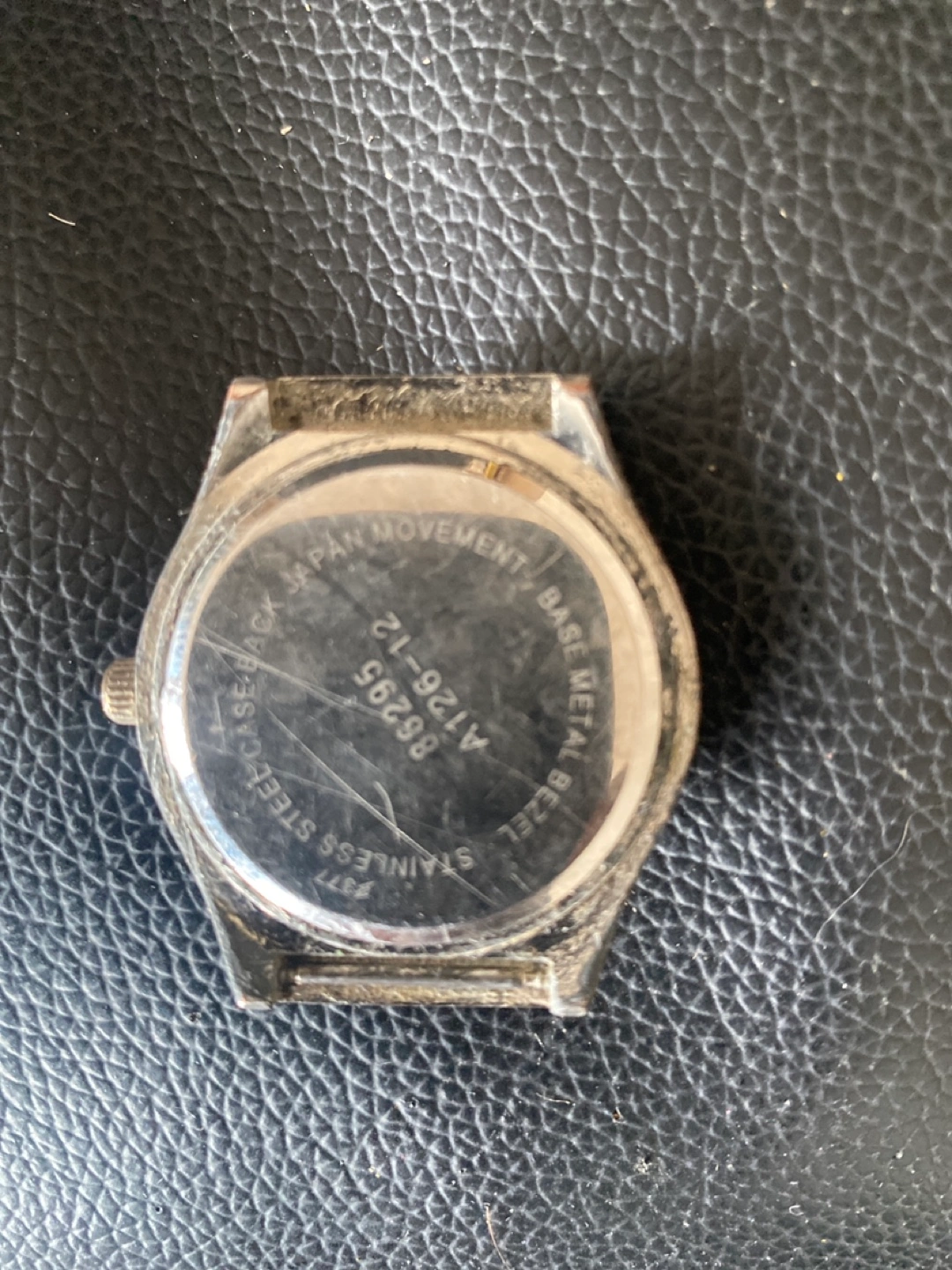 Selling a vintage watch. It has a stainless steel bezel and a Japan movement. The back of the watch is marked with '85295 A126-12'. It shows some signs of wear, but still a cool piece!
