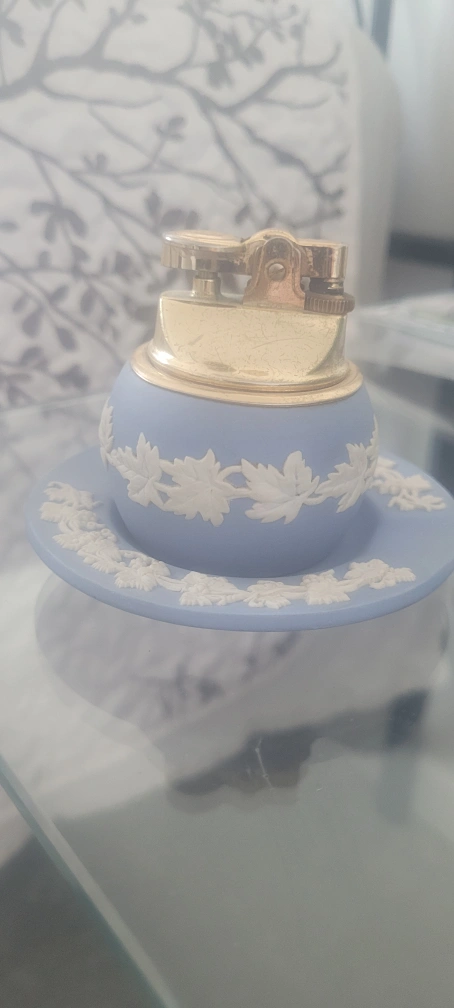 Selling a vintage Wedgwood lighter. It's a beautiful light blue colour with a white leaf pattern. The top is gold. A lovely piece for collectors! Could use a clean LIGHTER ONLY. PLATE SOLD SEPERATLY $45