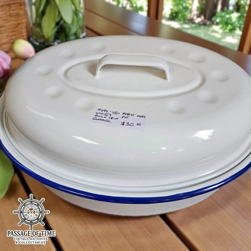Crafted for the home chef, this Vintage White & Blue Trim Enamel Oval Roast Pot brings a touch of elegance and durability to your kitchen collection. Its generous size is perfect for roasting meats and vegetables, ensuring your culinary creations are cooked to perfection while infusing your kitchen with a classic aesthetic. The pot features a robust white enamel finish with a chic blue trim that complements any kitchen decor. Whether you're hosting a dinner party or simply preparing a family meal, this versatile roast pot is an essential tool for any cooking enthusiast. It's a seamless blend of function and style that will be a valued addition to your kitchen repertoire. Condition: 9/10, like new in amazing condition inside and out Approx: 16” x 7” Large size