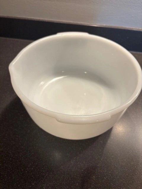 This vintage white Glasbake mixing bowl model 2 for the Sunbeam Mixer. The round bowl is roughly 9 inch diameter, and 4 1/2 inch height, making it suitable for a variety of occasions and all occasions. Made of durable glass, it is easy to clean and dishwasher safe, perfect for everyday use or special retro-inspired cooking projects. With its original 1960s style and American manufacturing, this mixing bowl embodies the nostalgia and charm of vintage cooking tools.
