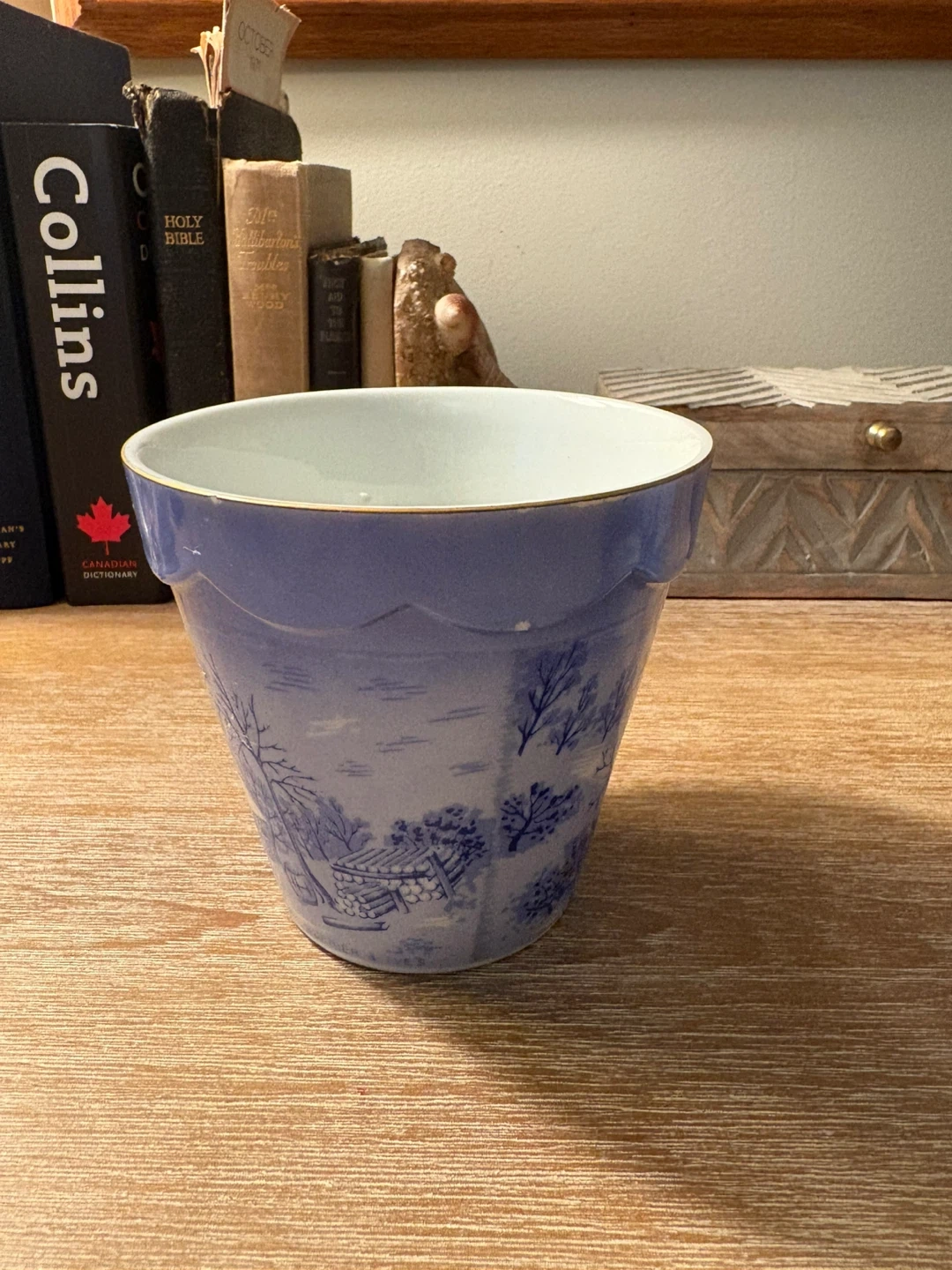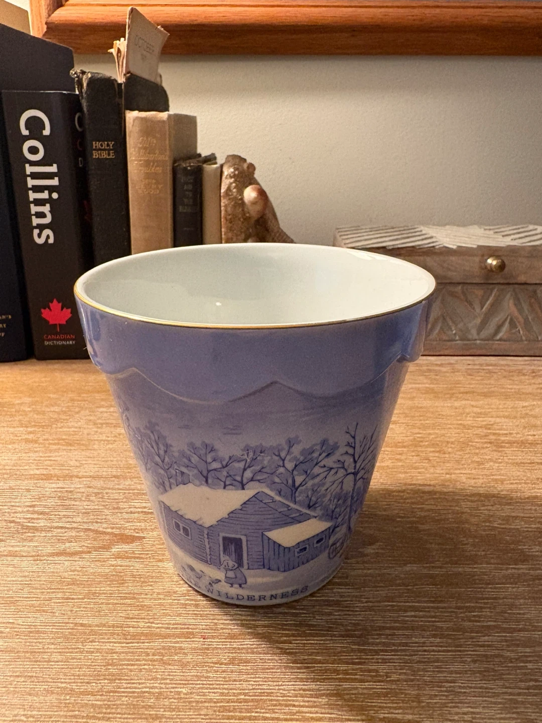 Selling two vintage planter pots with a lovely " Home in the Wilderness" design from Currier and Ives . It features a detailed scene of a cabin and winter landscape in blue on a light blue background. The rim is trimmed with a delicate gold line. Dimensions are 4 inches tall by 4 inches wide at the top. $3 each or two for $5. It would make a charming addition to any home! Niagara Falls North end location. Cash only