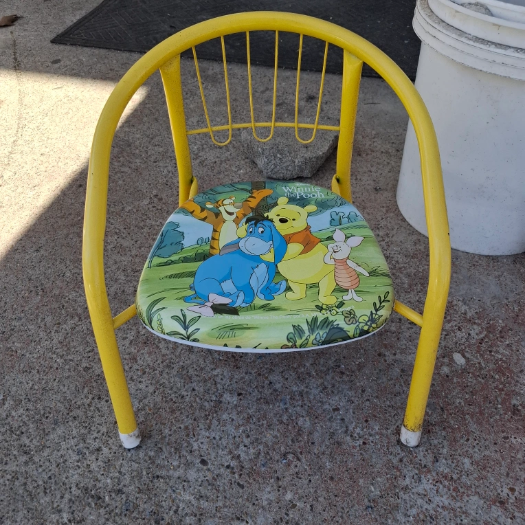 Yellow metal children's chair. Features a Winnie the Pooh design on the seat. Suitable for toddlers or young children. Shows some minor wear.