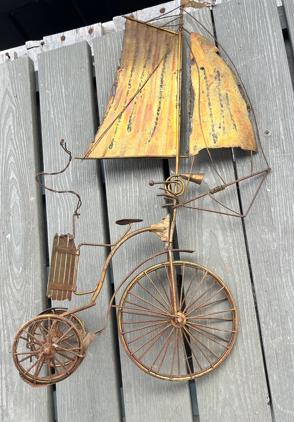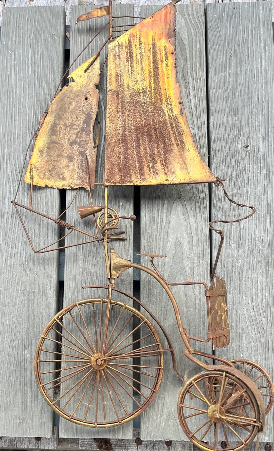 Unique vintage wire sculpture. Features a tricycle with a sail. Metal construction, shows age and wear. Great conversation piece. Wall hanging.