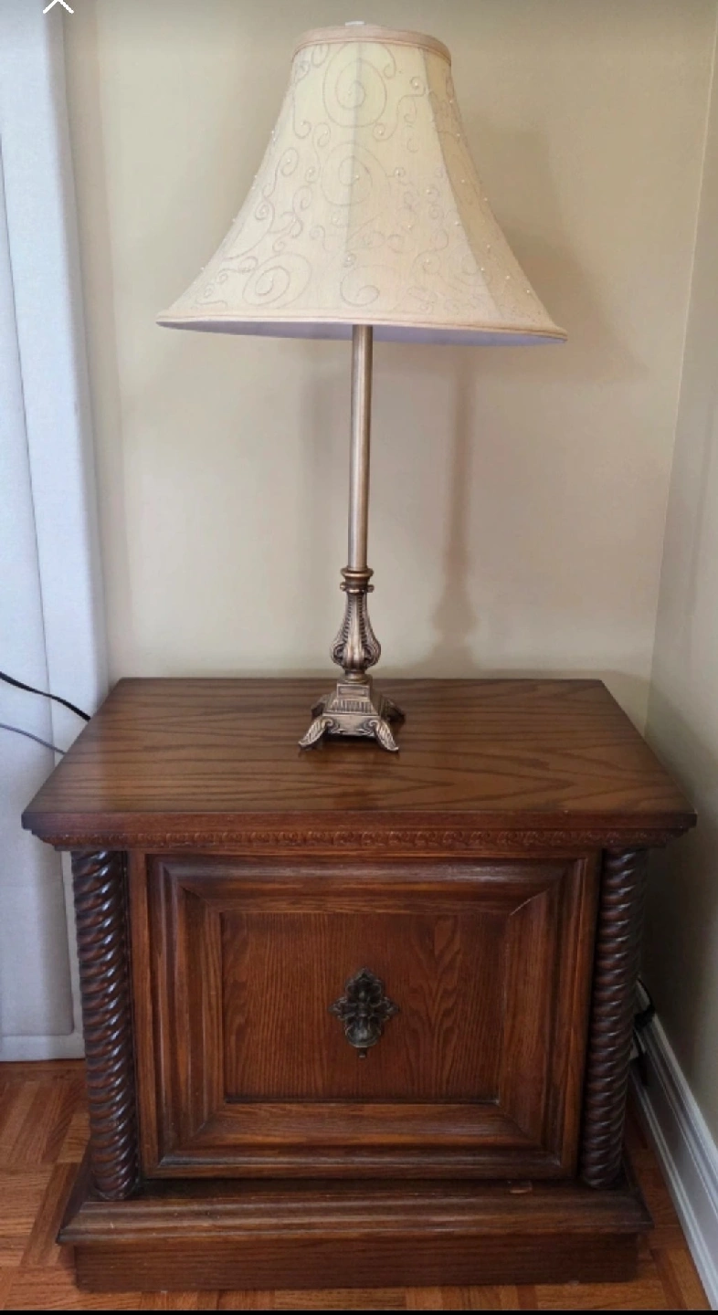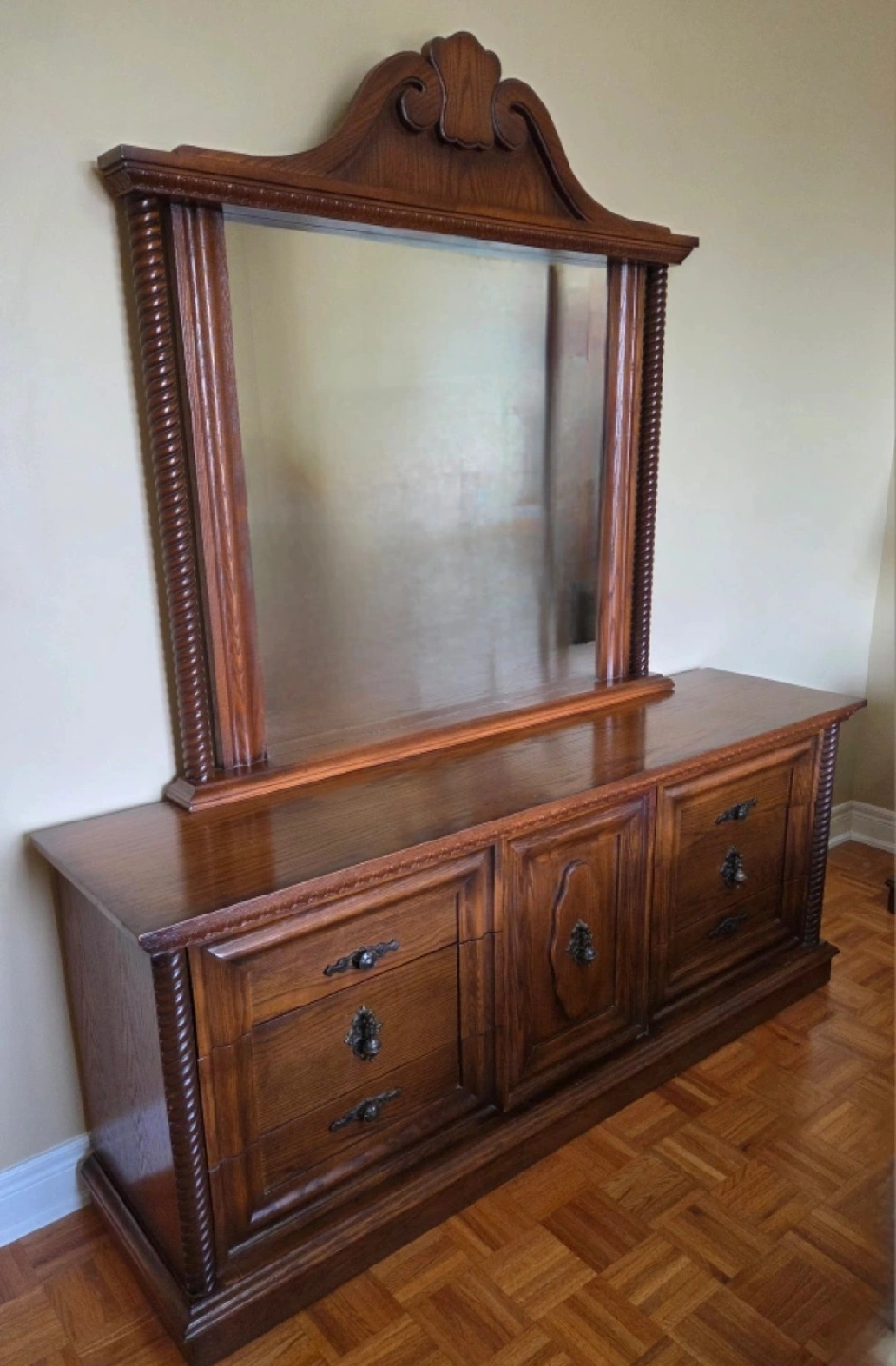 Selling a beautiful vintage bedroom set! This set includes a dresser with a mirror, a tall boy, a headboard, and 2 nightstand with lamps. The wood has a lovely, rich tone and the details give it a classic look. Perfect to add some vintage charm to your bedroom! Gorgeous dark oak bedroom set. Includes headboard, dresser with mirror, armoire, and two matching nightstands with lamps. Elegant design, scrolled details, and twisted columns. Solid wood construction. Excellent condition. Pick up only. Tall boy 18D x 43W x 59H Night stand 15D x 27W x 24H Dresser with mirror 19D x 72W x 80H Headboard 63W x 65H