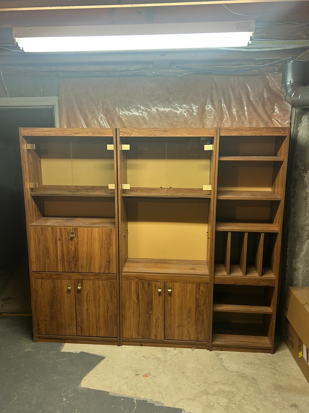 Selling a vintage wood wall unit or bookcase. It features a beautiful wood grain finish and offers ample storage with both open shelving and closed cabinets. Perfect for adding a touch of retro charm to your home!
