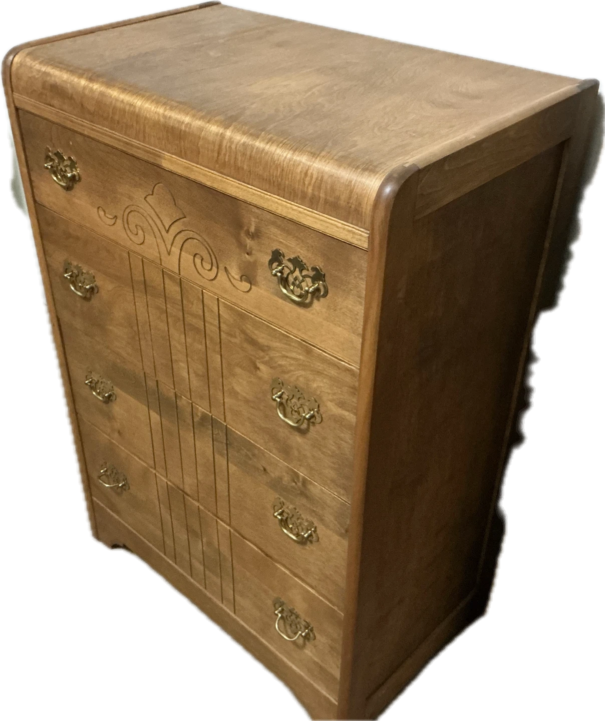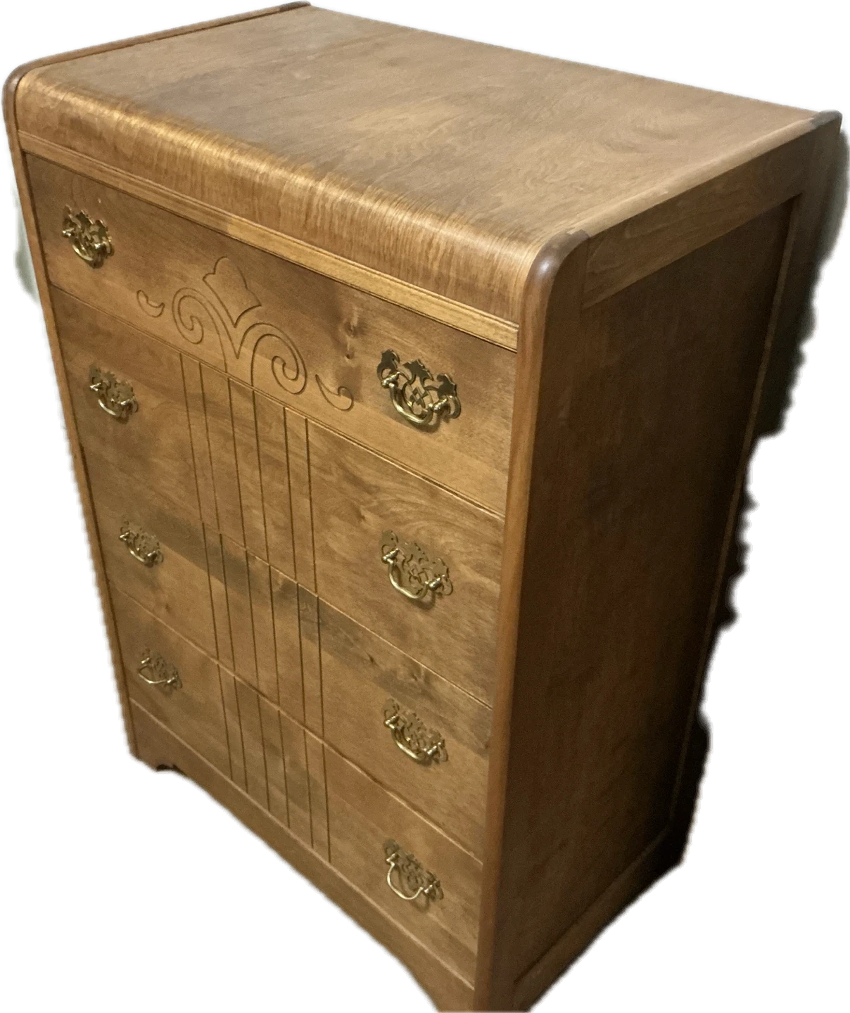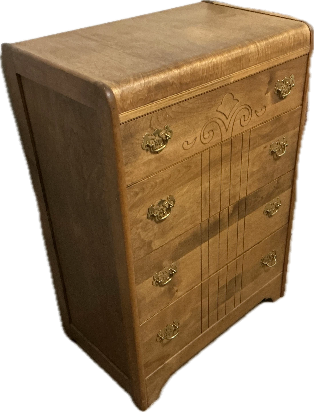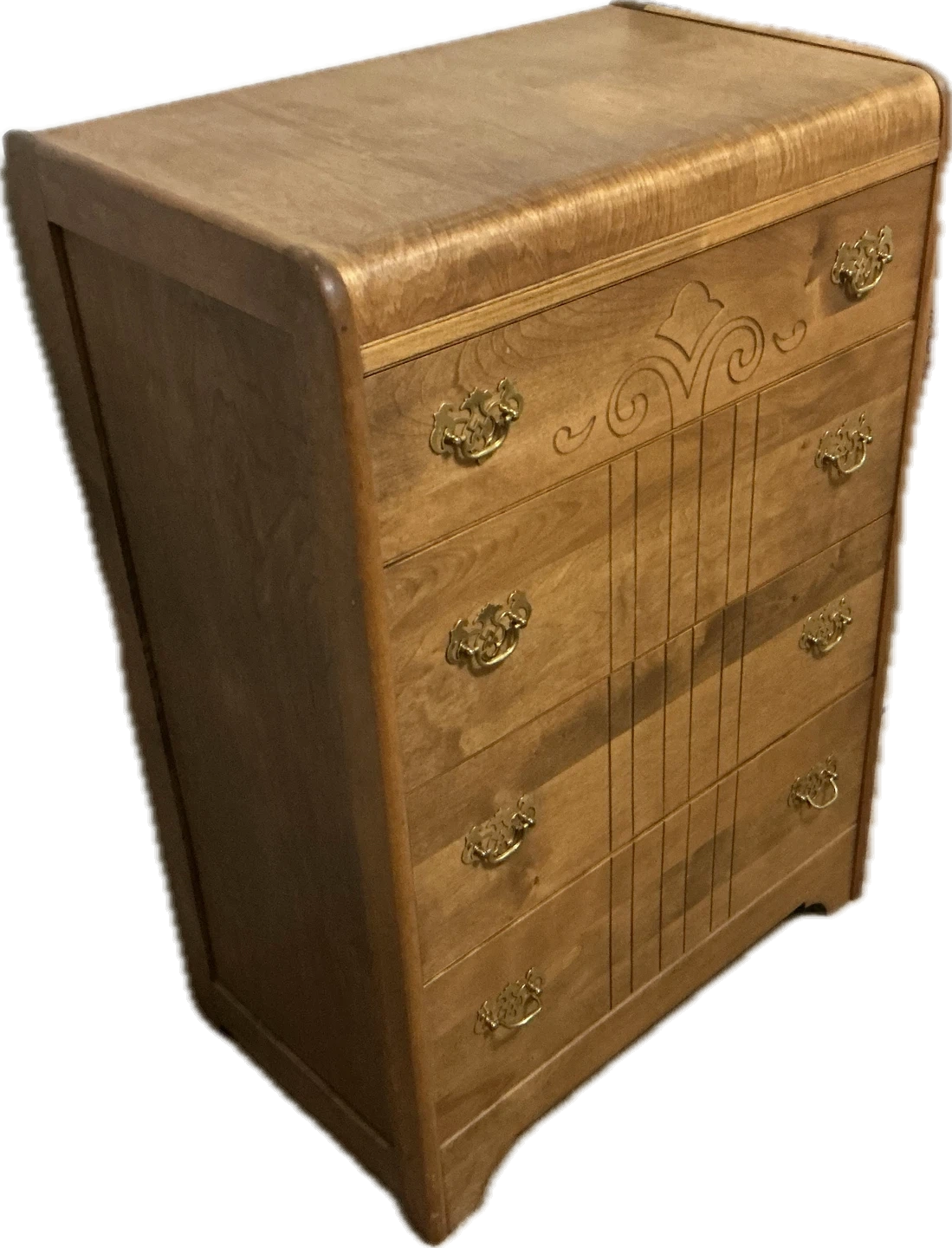 Selling a vintage wooden dresser with four drawers. It has a unique, classic design with ornate handles. It would be a great addition to any bedroom or living space! It's in good condition for its age and ready for a new home