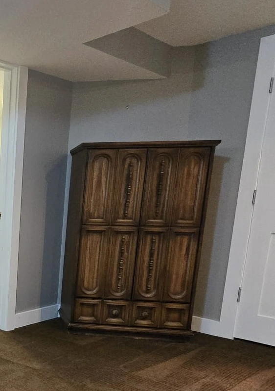 Selling a vintage wooden armoire. It's a beautiful piece of furniture that would add character to any room! It has a classic design with paneled doors and drawers at the bottom. Perfect for storing kitchen ware dishes etc .