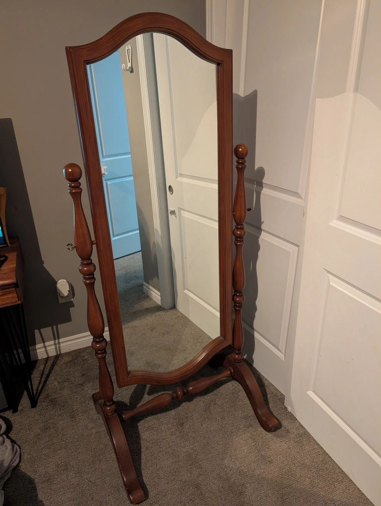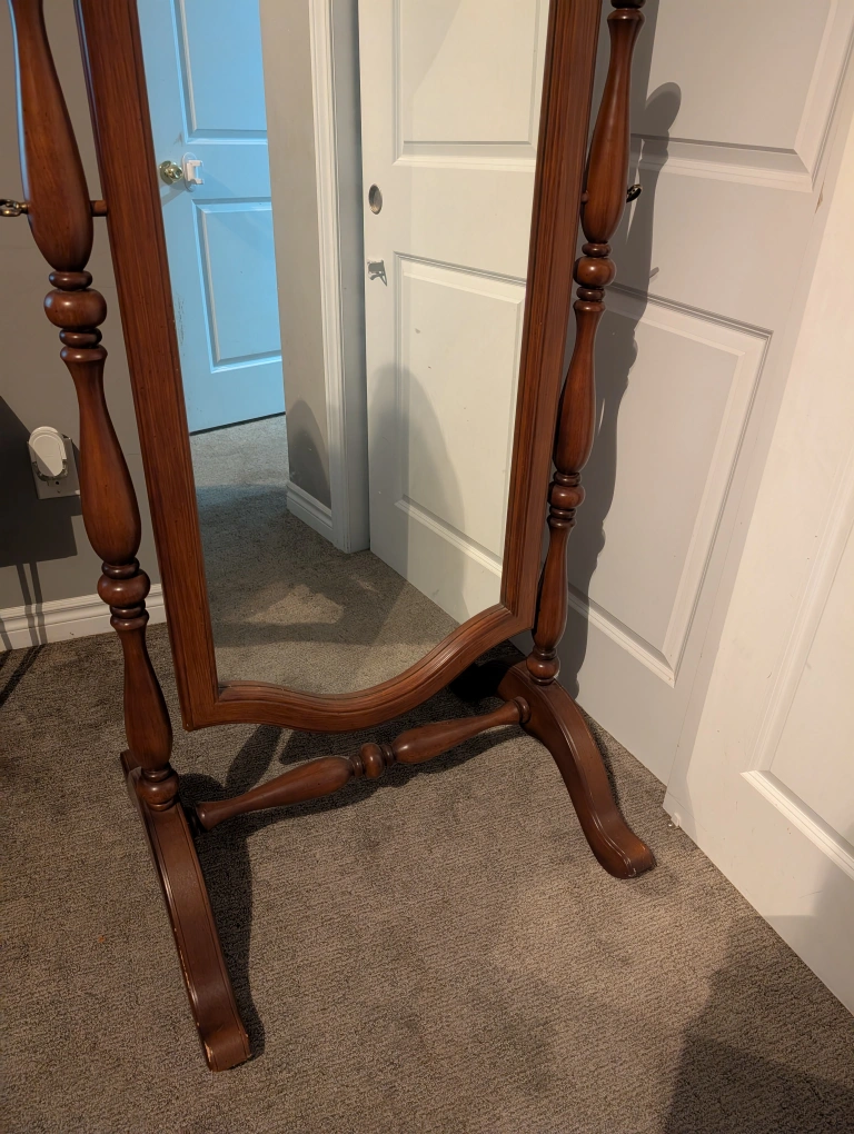 Here's a lovely vintage cheval mirror with a wooden frame! It's a beautiful piece that would add a touch of elegance to any room. The mirror is in great condition and ready to find a new home