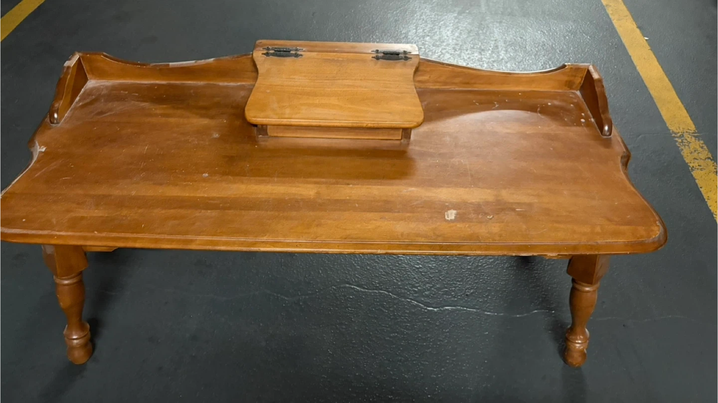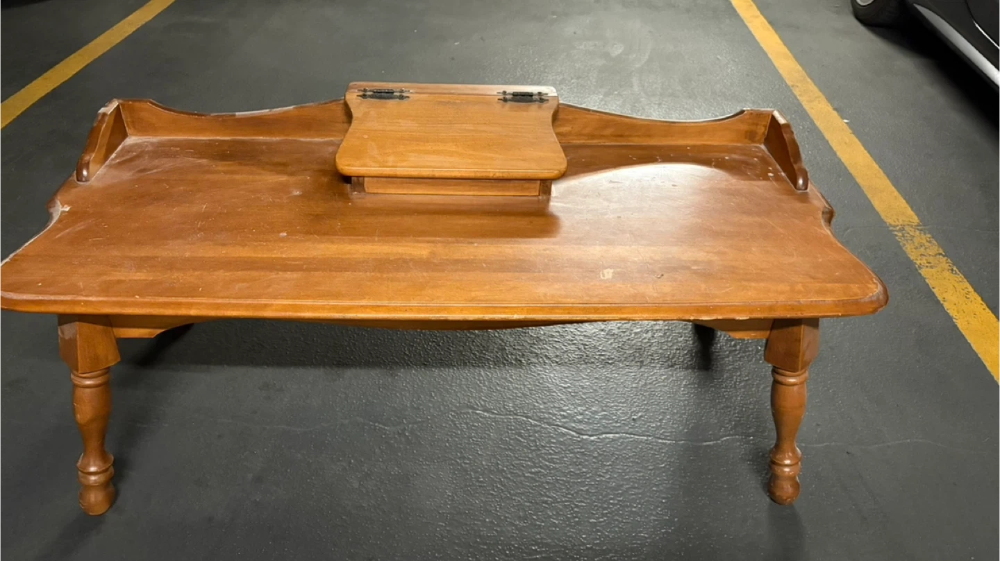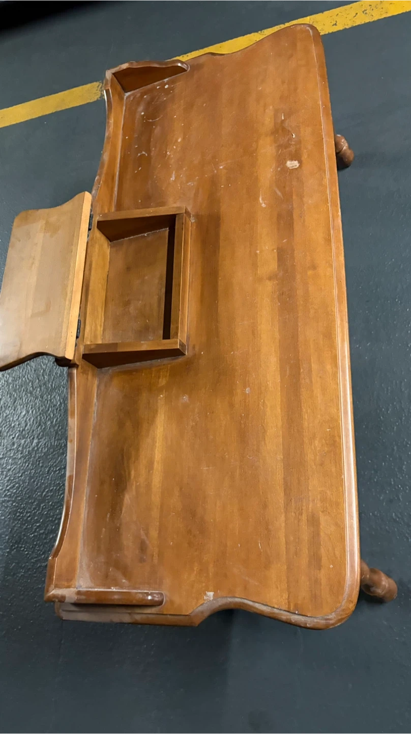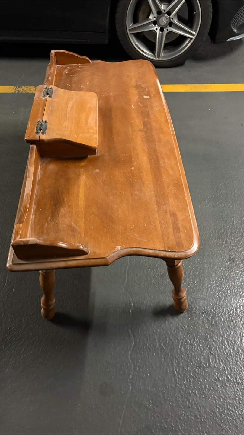 Selling a vintage wooden coffee table. It has a unique design with a small storage compartment in the middle. It is sturdy and functional. Perfect for adding a touch of rustic charm to your living room!