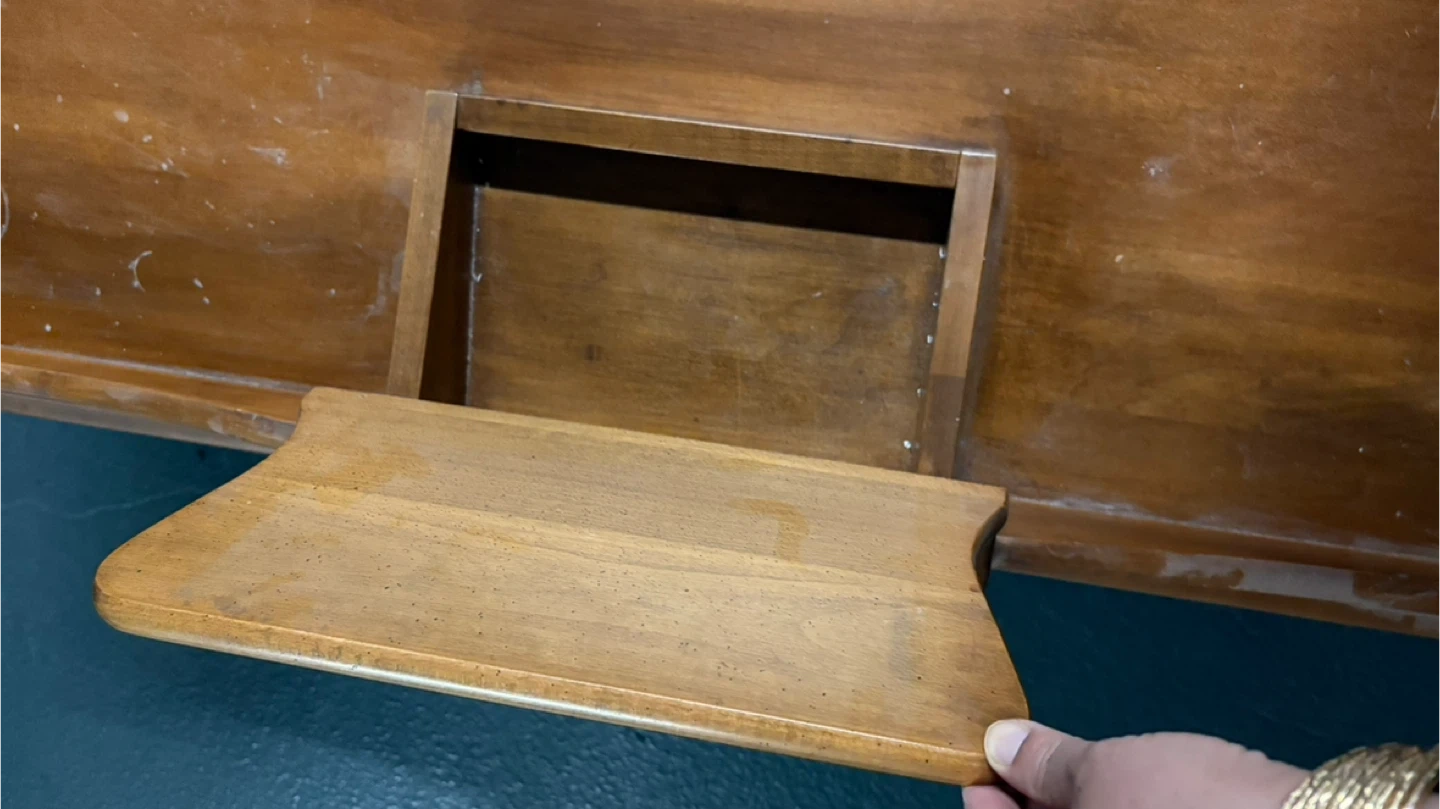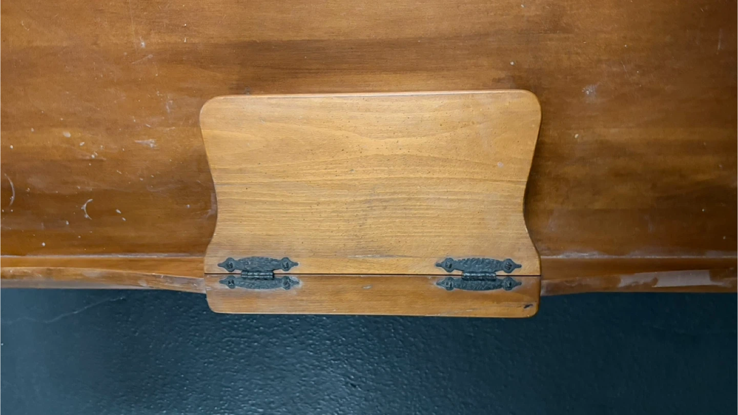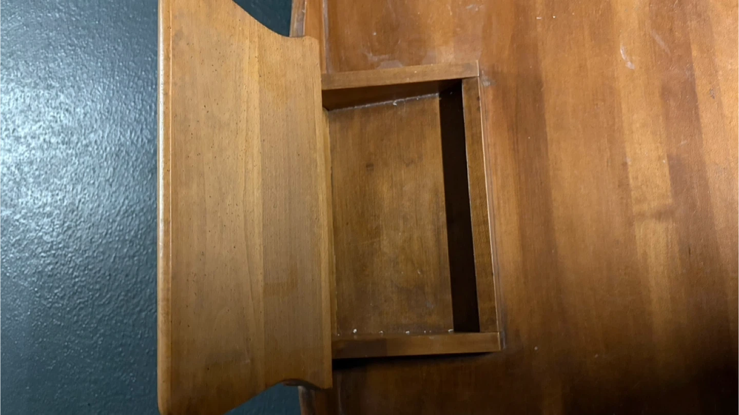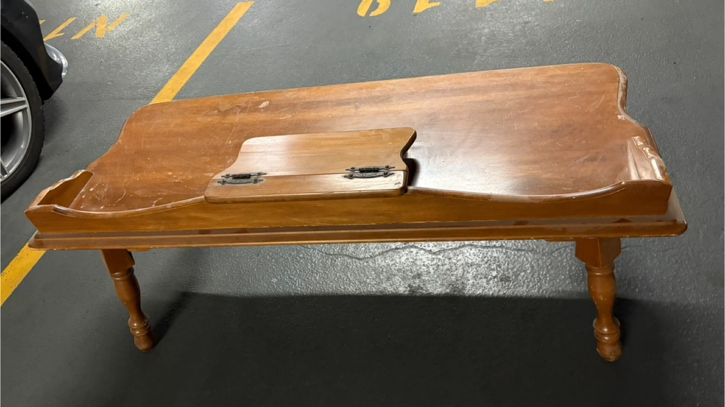 Selling a vintage wooden coffee table. It has a unique design with a small storage compartment in the middle. It is sturdy and functional. Perfect for adding a touch of rustic charm to your living room!