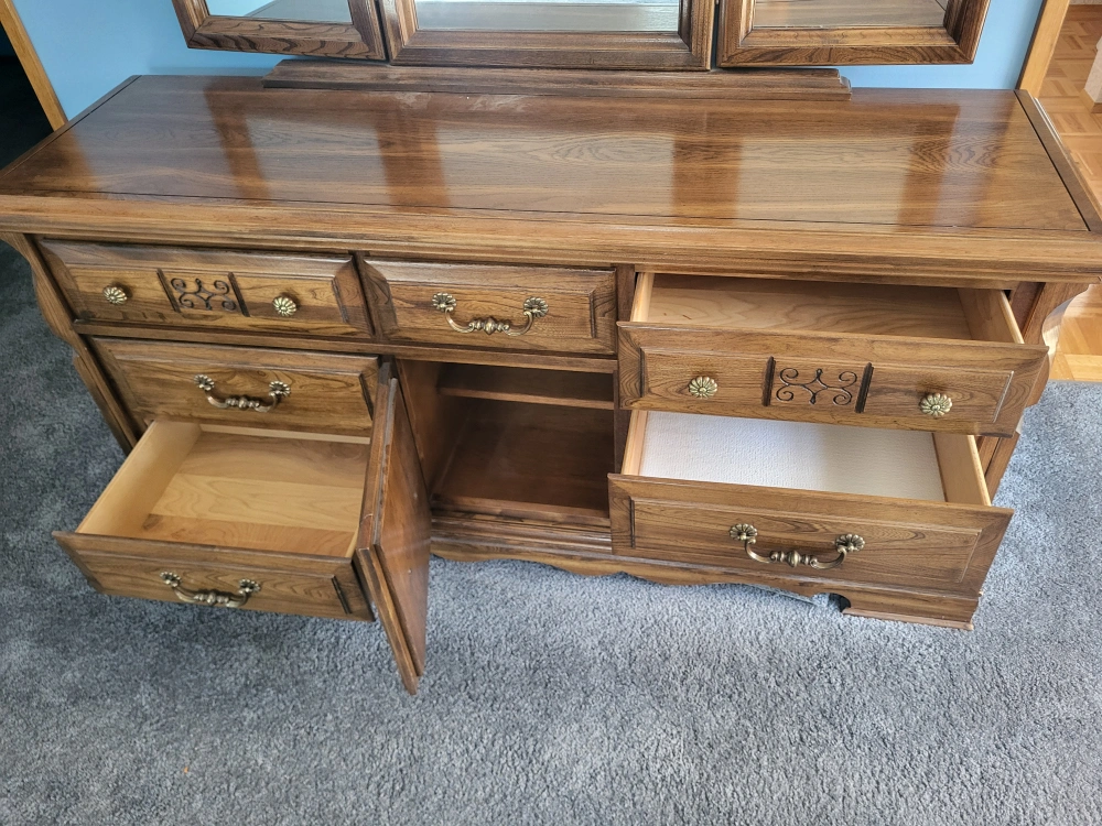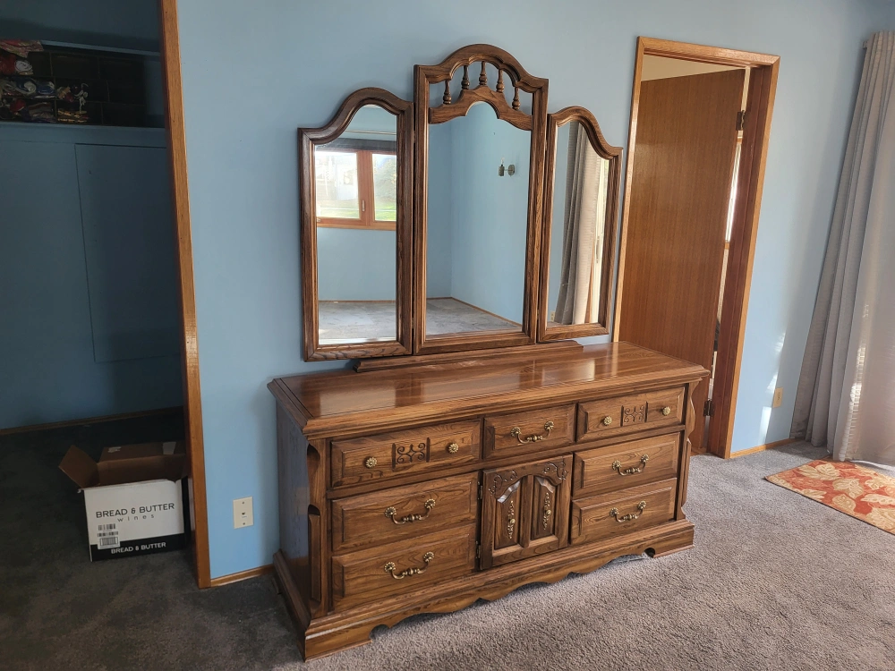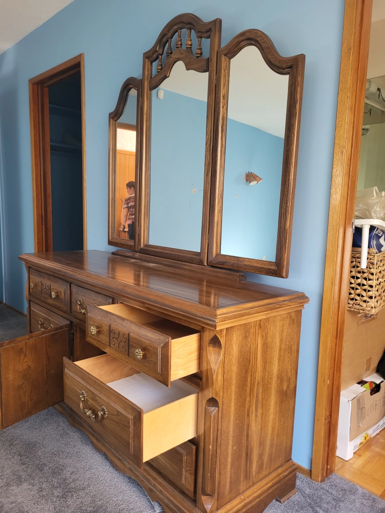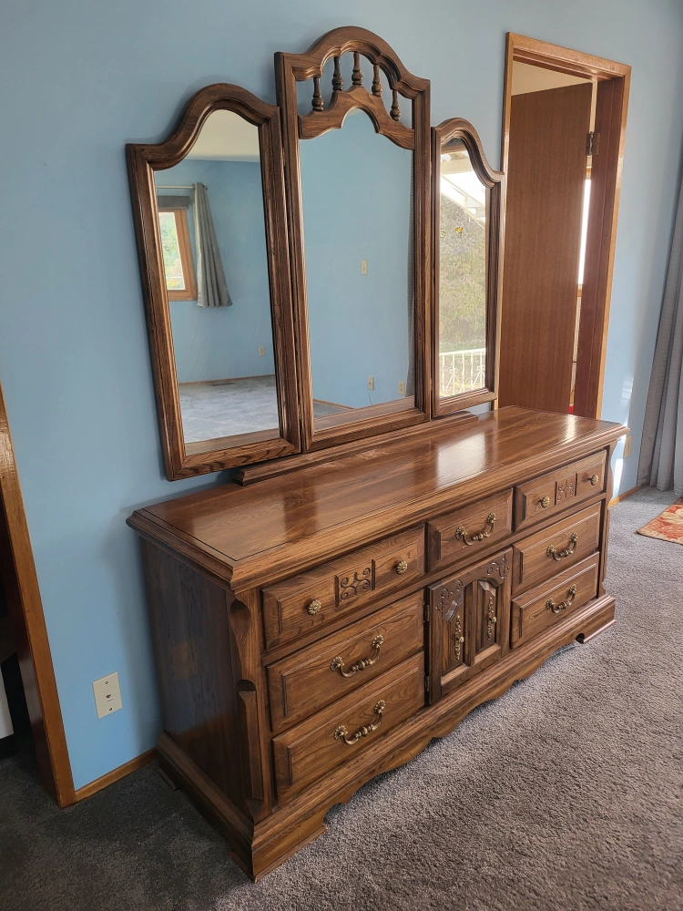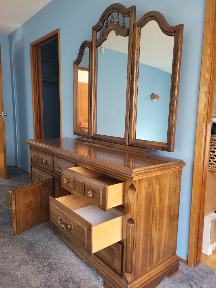 Vintage Dresser with Triple Mirror π Dimensions: 64" W x 32" H x 19" D This solid wood dresser comes with nine spacious drawers and a triple-panel mirror with beautiful carved detailing. Plenty of storage space, smooth sliding drawers, and a timeless design that adds elegance to any bedroom. β Excellent condition β Classic brass handles & accents β Center cabinet doors for extra storage All proceeds go towards supporting Moving Forward to New Beginnings π β helping families and individuals in need get a fresh start. π² Asking Price: $190 π Pickup in Red Deer π Delivery available (free within Red Deer) $1.05/km delivery fee. Sorry folksβ¦ the handsome guy in the mirror doesnβt come with it π Uhm Okπ π© Message me to arrange pickup or delivery! #FurnitureForSale #RedDeer #MovingForward #BetterTogether #VintageDresser