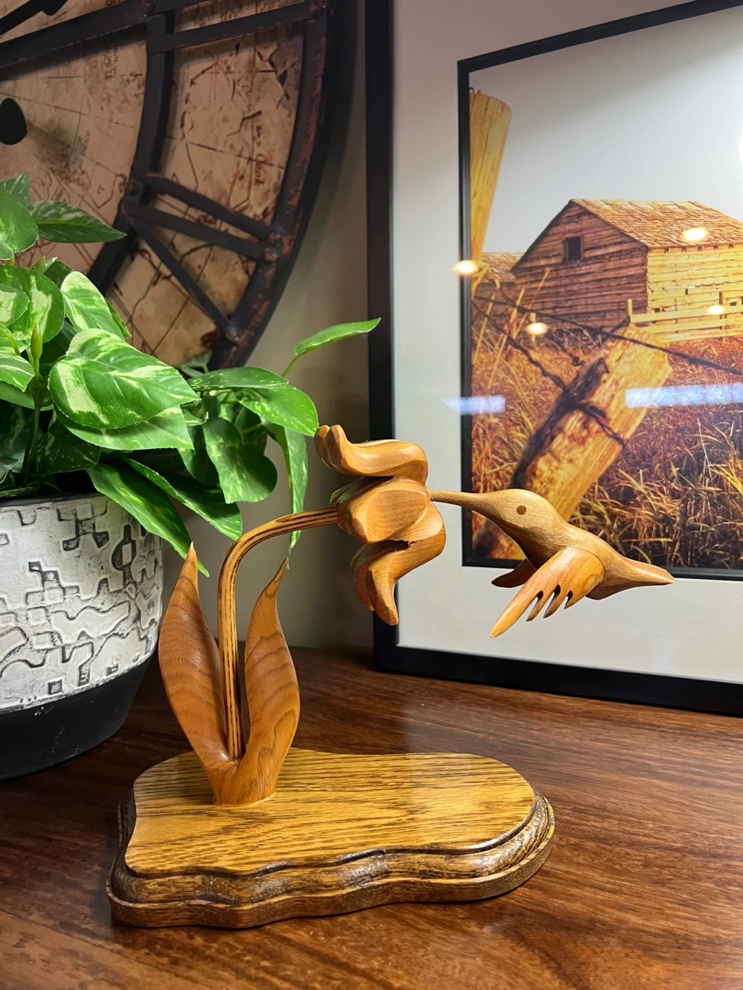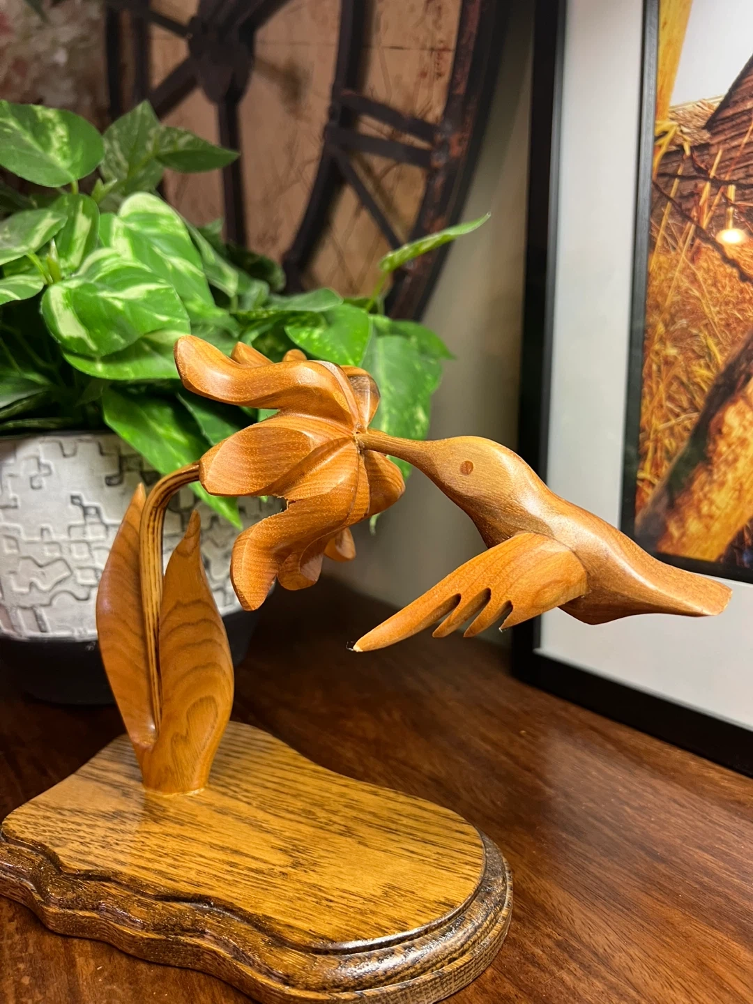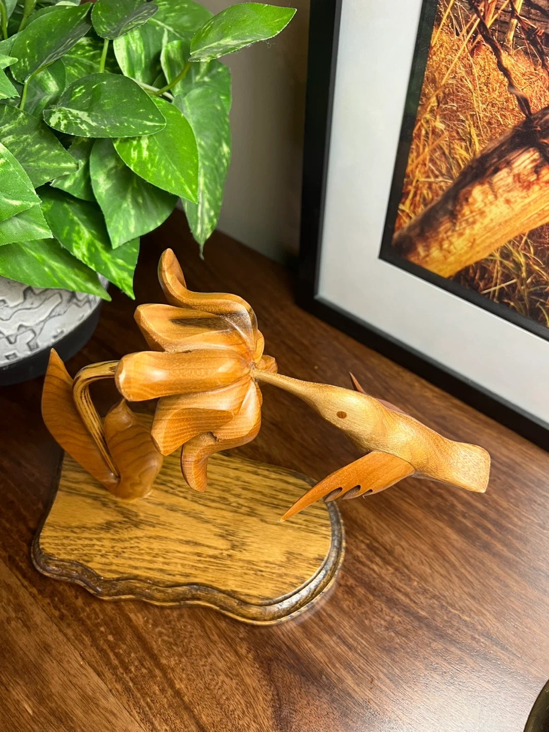 Wooden, handcarved hummingbird feeding on a flower Signed on the bottom Perfect condition No smoking home Approximately 8” tall and 10” wide Beautiful, unique artistry !! Asking $30 Interested? Message me and please check my other listings…