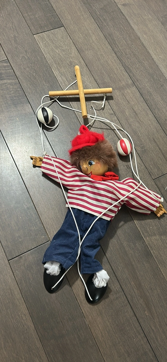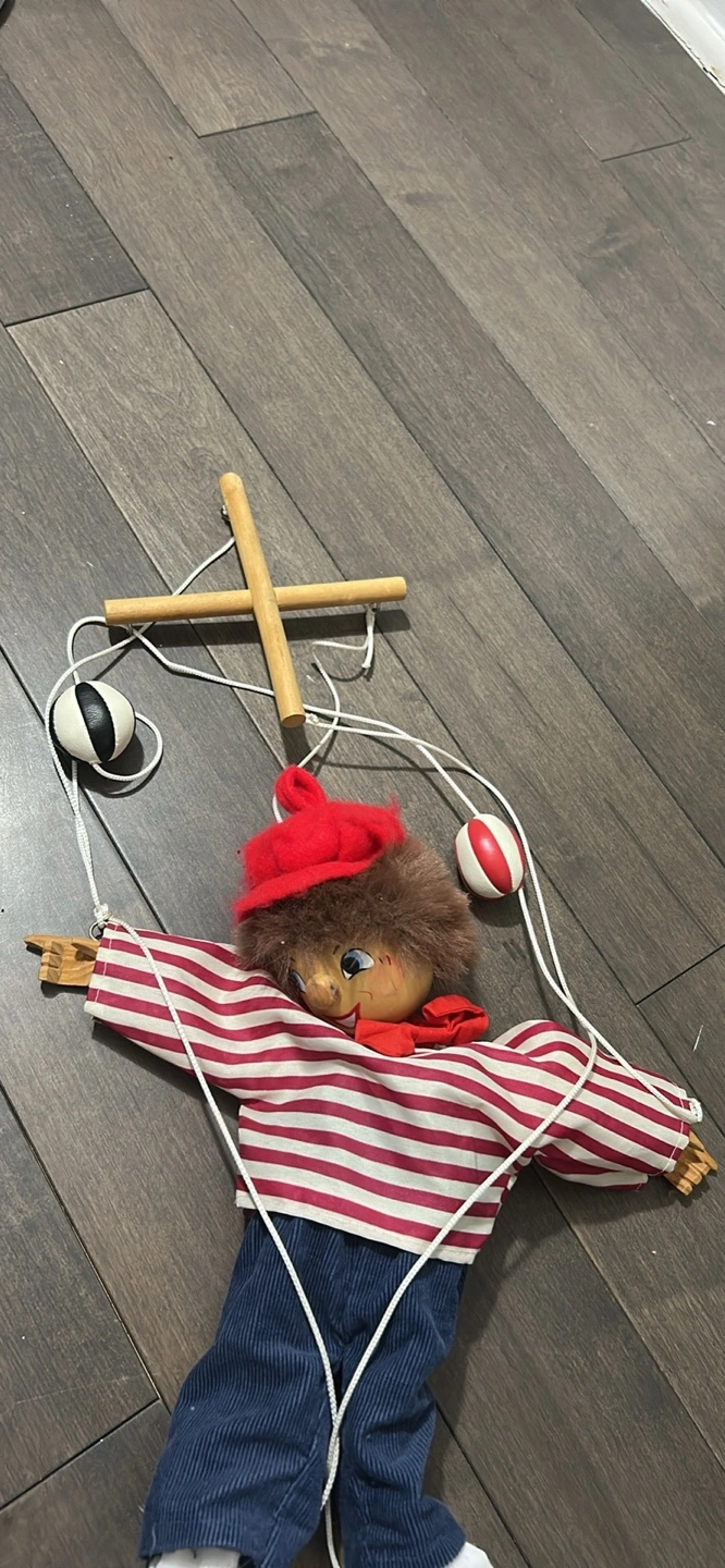 Adorable vintage marionette puppet. Wooden construction. Red and white striped shirt, blue pants. Comes with control strings and three small balls. Great collectible or decorative piece.