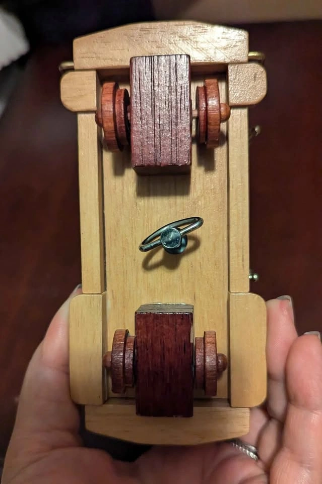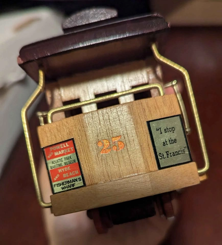 Charming wooden cable car music box from the 1970s-80s, handcrafted with brass details and marked “San Francisco Municipal Ry. no. 25". Wind-up mechanism plays a soft tune when turned. Beautiful condition, a nostalgic collectible or San Francisco souvenir. Plays tune: 'I left my heart in San Francisco' Material: Solid wood & brass accents Size: Approx. 6" L × 3" H × 2.5" W Condition: Excellent, fully functional
