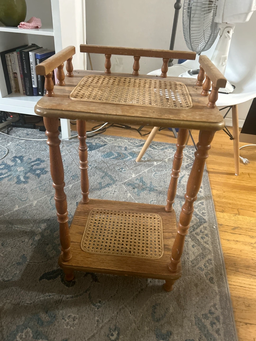 Selling a charming vintage wooden side table! It features a lovely rattan top and bottom shelf, perfect for adding a touch of retro style to your home. The table has a warm, natural wood finish and a unique design with its spindled legs and top railing. It's a great piece to display plants or books!