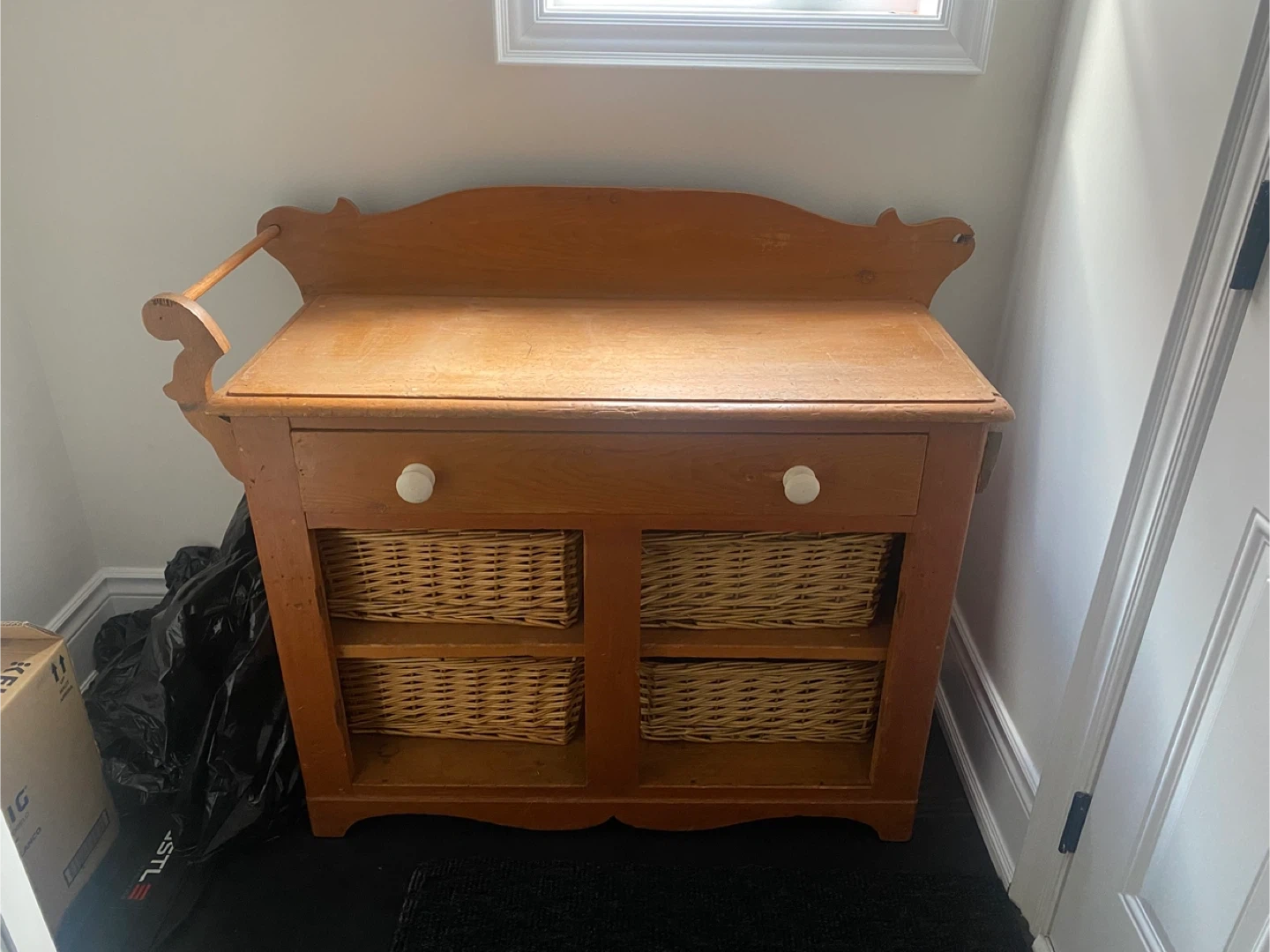 Selling a charming vintage wooden washstand! It features a drawer and two wicker baskets for storage. Perfect for adding a rustic touch to your home. It's in good condition and ready for a new home!