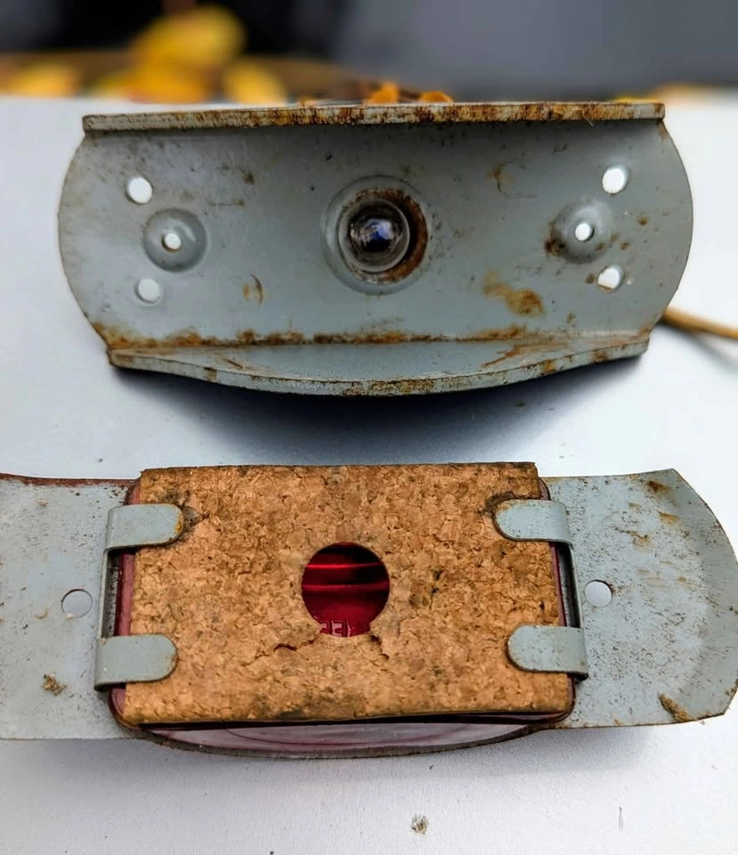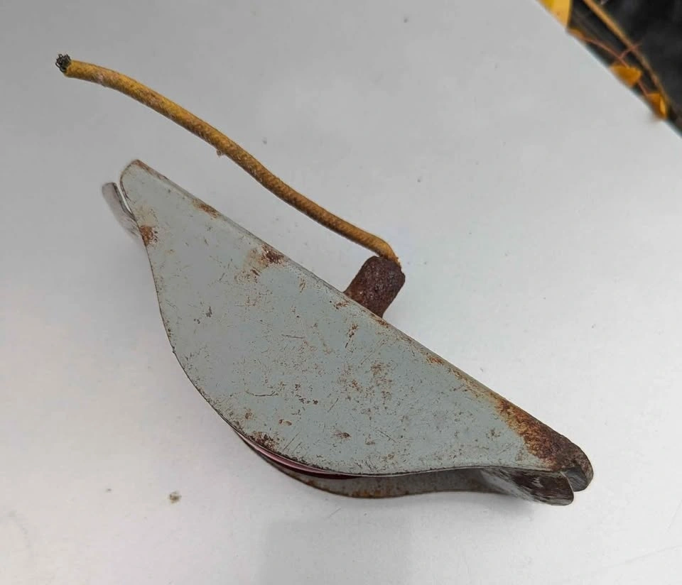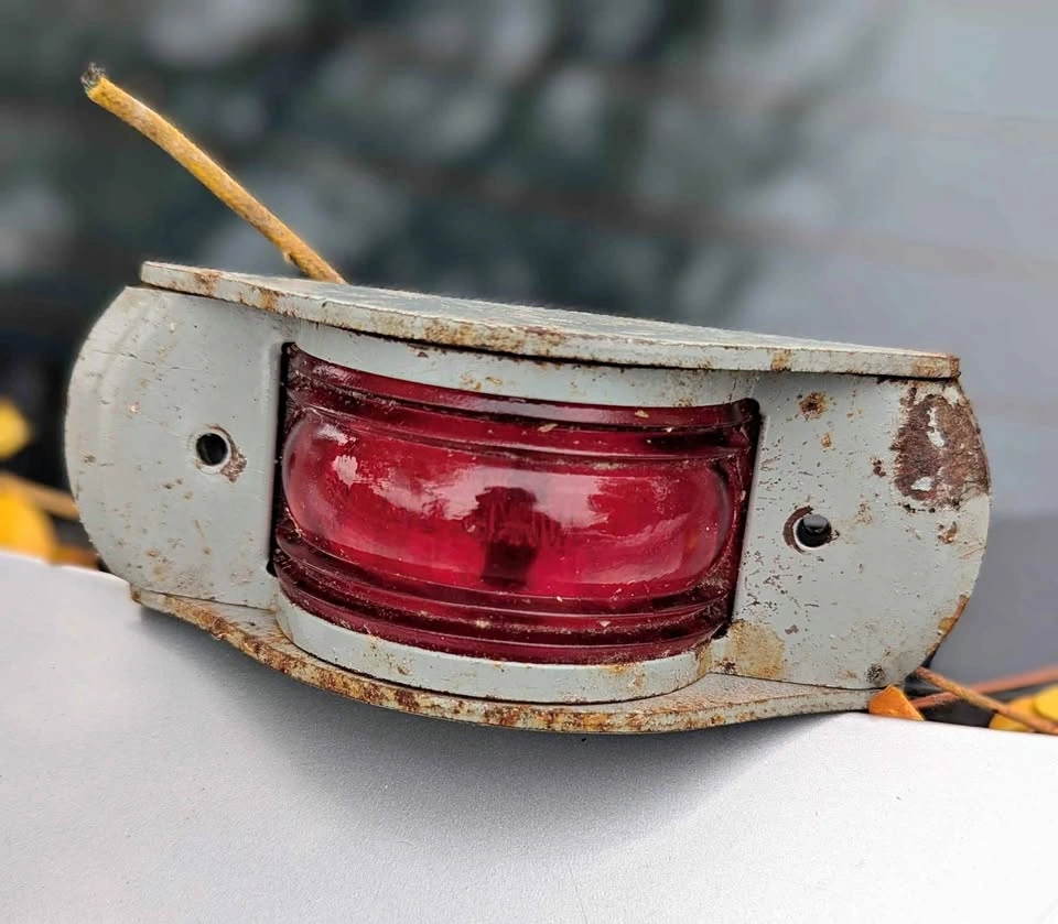 Authentic mid-century Yankee Metal Products Co. red marker / tail light. Heavy steel housing with original gray enamel finish, red glass lens, cork gasket, and cloth-wrapped wiring. Stamped “YANKEE 75.” Great patina and solid condition for age — perfect for vintage trailer, rat-rod, or early truck restoration. 👉Untested but all parts intact. Classic truck or trailer restoration Hot rods and rat rods Industrial décor or retro lighting projects