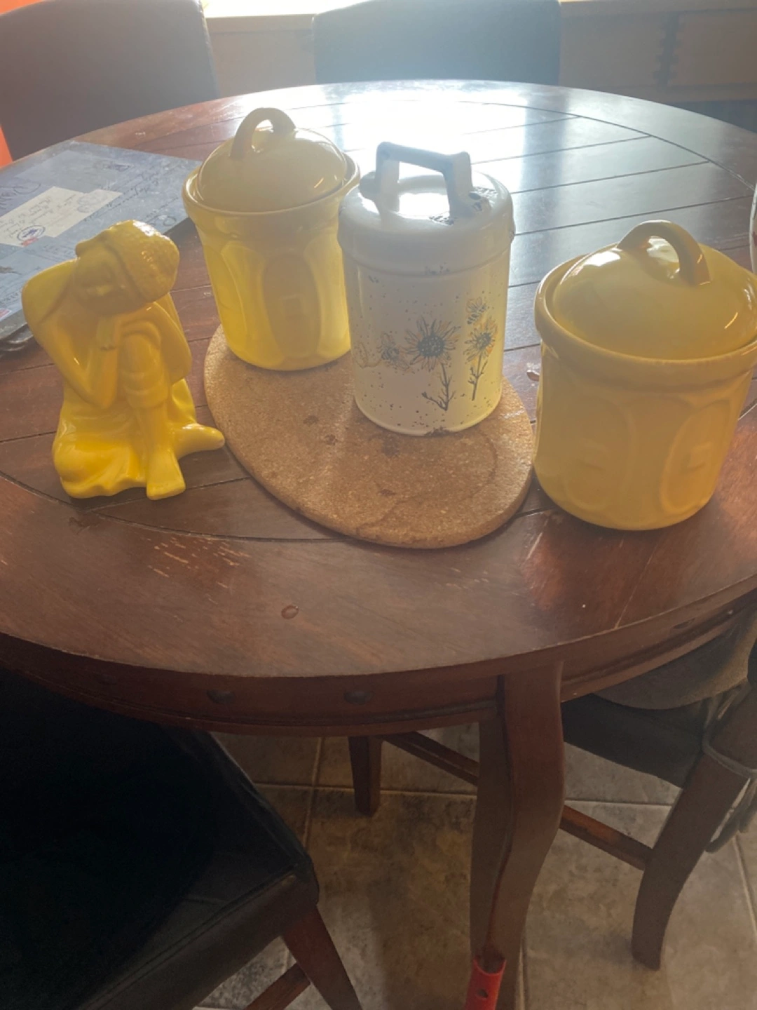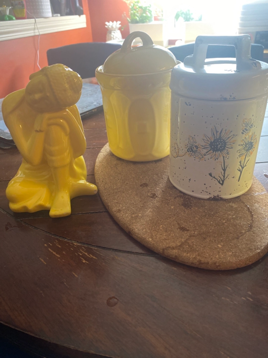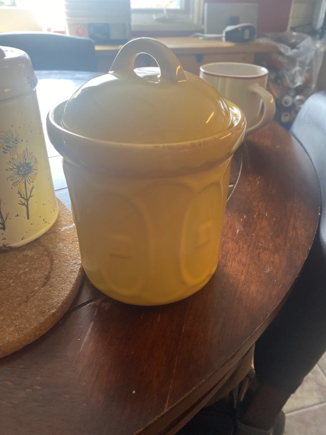 Adorable vintage yellow ceramic canister. Perfect for storing sugar, tea, or other pantry staples. Features a simple, elegant design. Small lidded container.