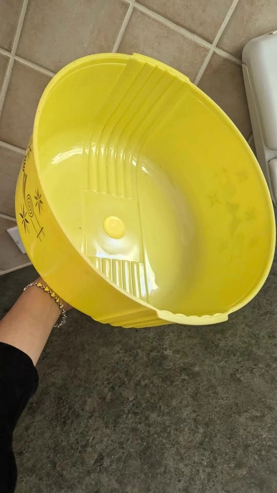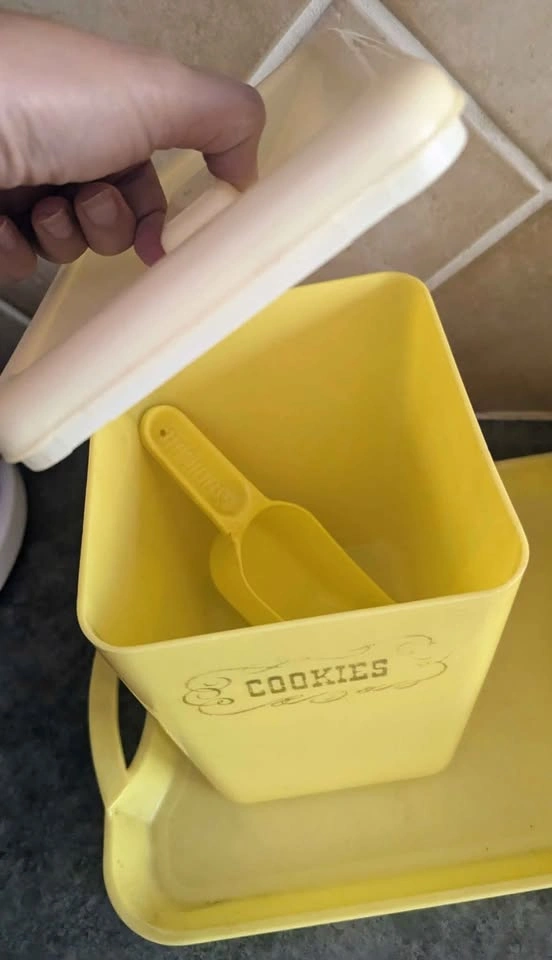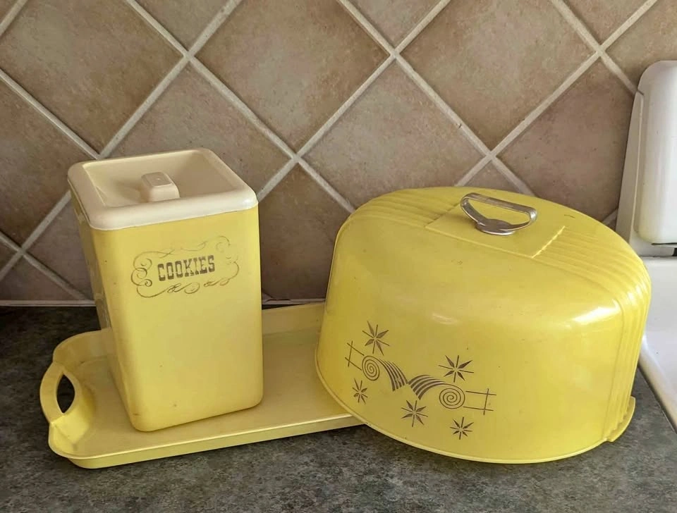 Vintage surface stains but overall good vintage condition. Yellow Plastic - cake cover - cookie canister w/scoop - yellow tray Sold as a lot for $20, must take all.