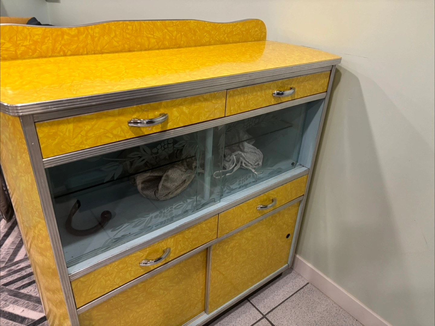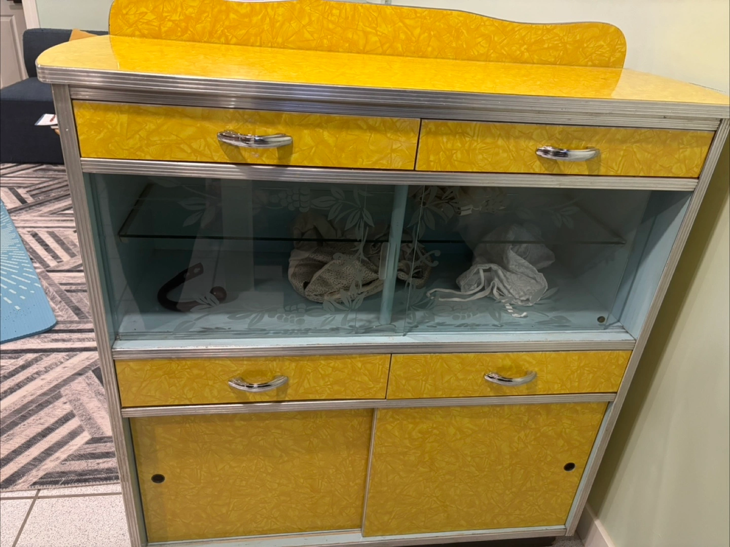 Selling a vintage kitchen cabinet in a cheerful yellow colour! It has a unique retro design that would add a pop of colour to any kitchen or dining area. It features drawers, a glass-fronted display area, and lower cabinet space for storage. A great piece for anyone who loves vintage furniture! Must be carried up an easy flight of stairs.