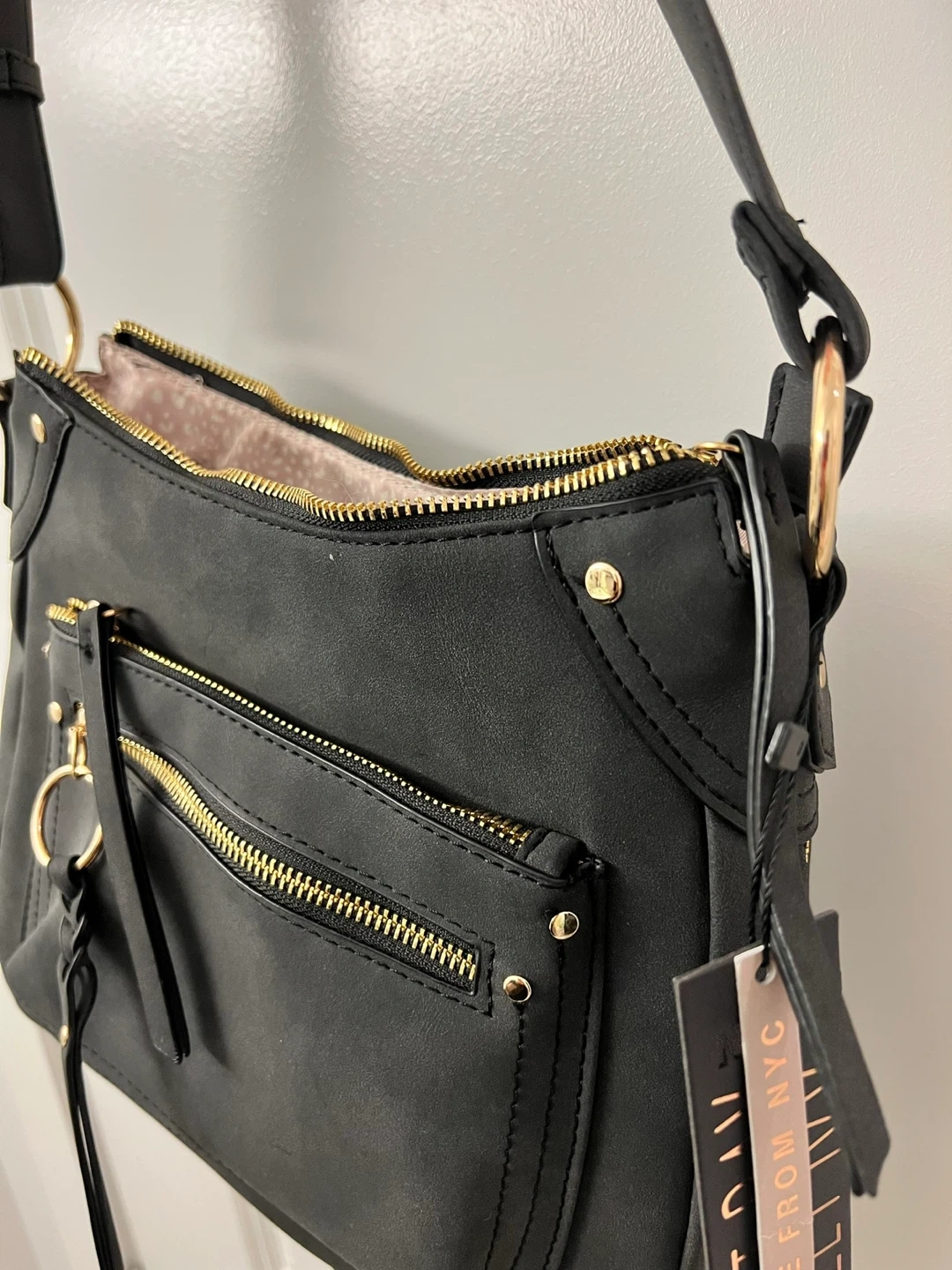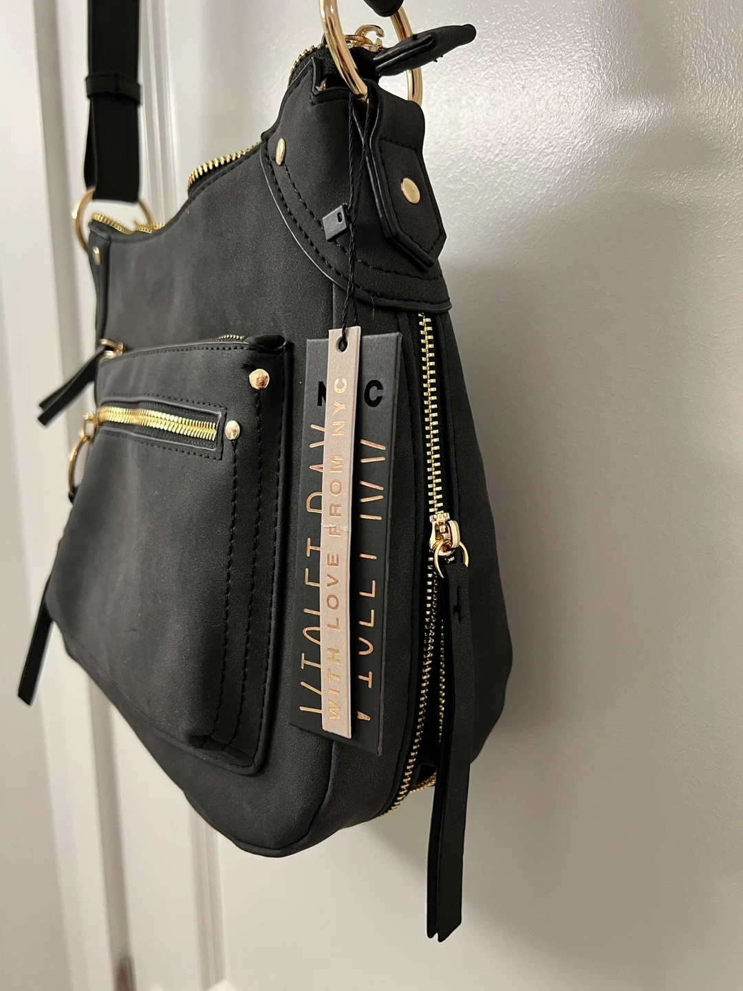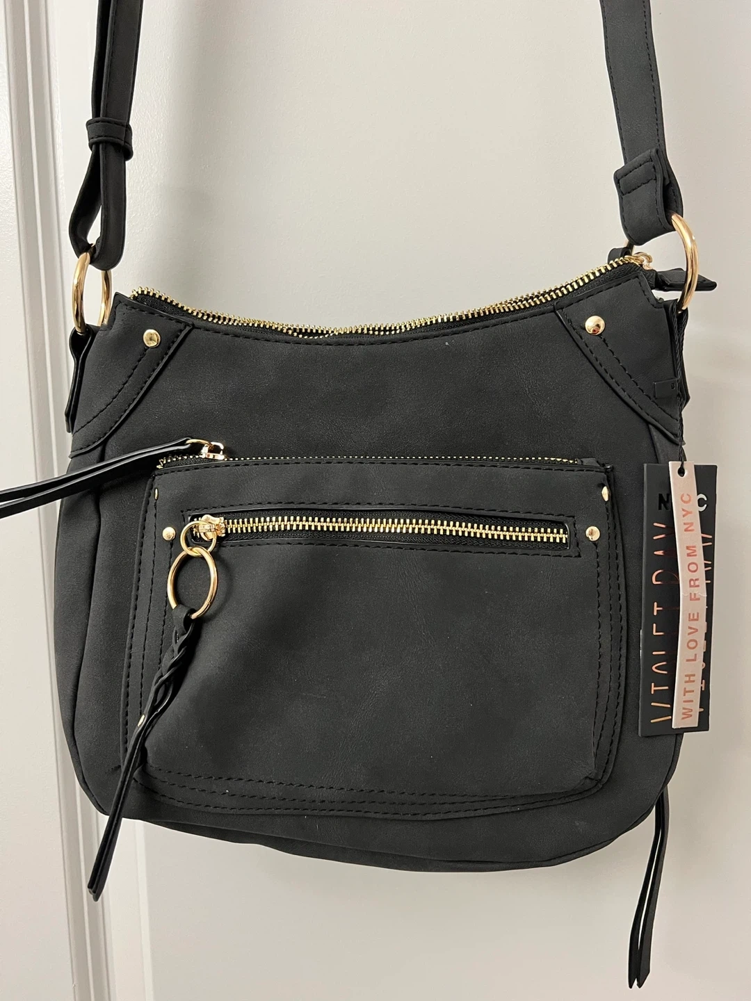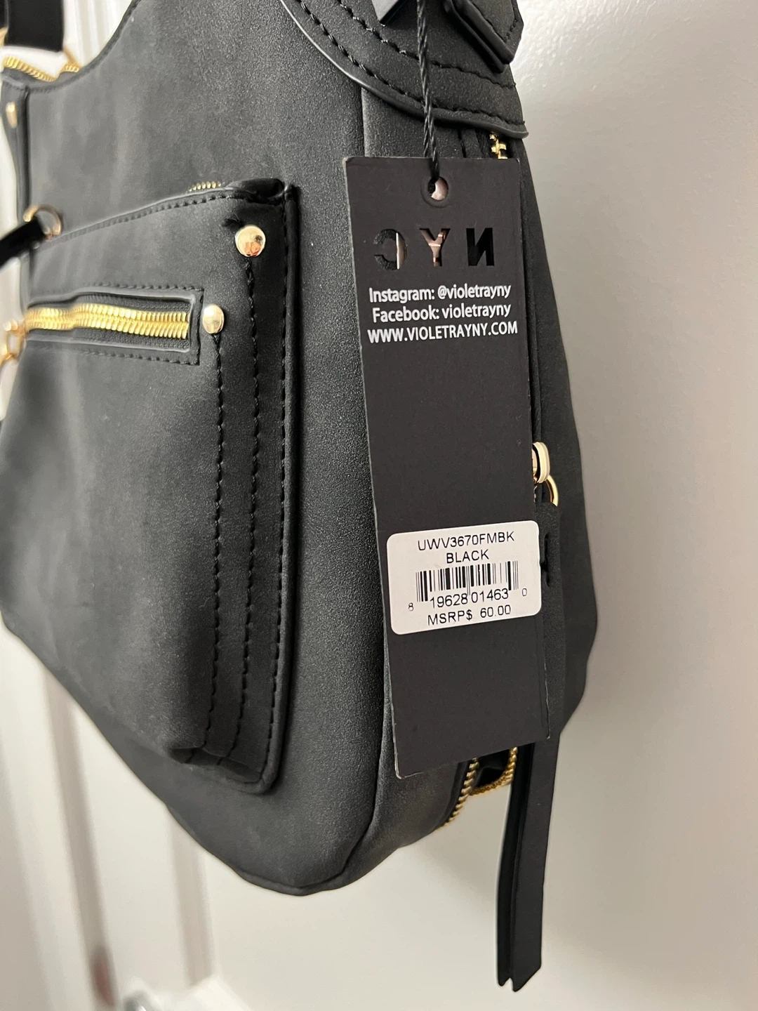 This Violet Ray NYC crossbody bag is brand new with tags! It's a stylish black colour and features gold hardware. The tag shows the MSRP was $60. It's a great size for everyday use, with a convenient front pocket and zipper details. This bag has never been used, looking for a new home :)
