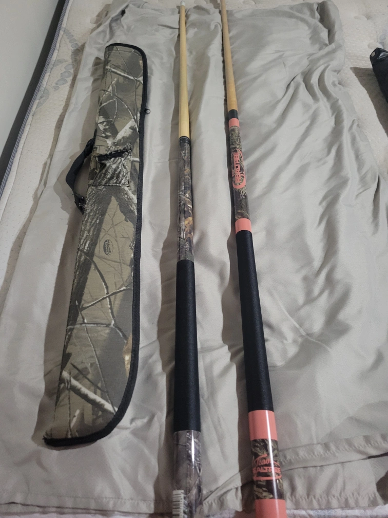 TWO Viper realtree pool cue sticks! One features a camo pattern and the other is a Team Realtree design. KIDS cue is 16oz comes with a carrying case. Adult is 19oz. (pink)