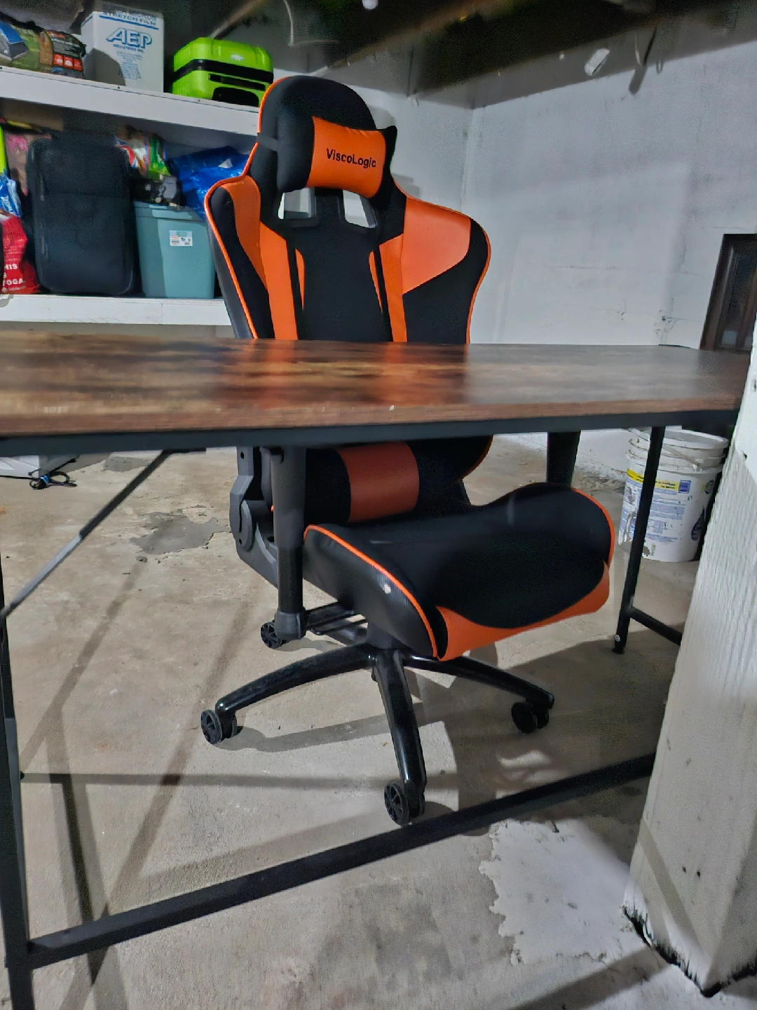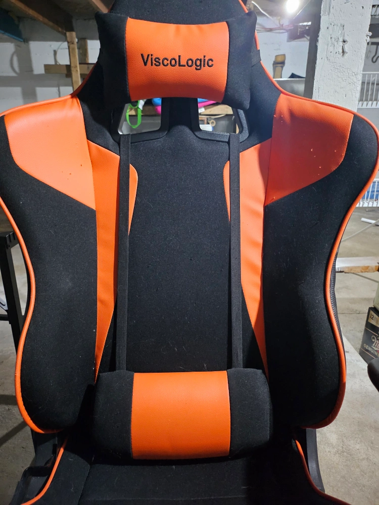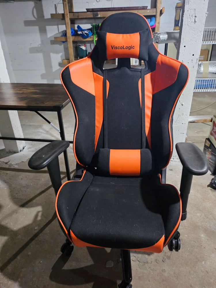 Selling a ViscoLogic gaming chair in orange and black. It has some signs of wear, as shown in the pictures, but it's still a functional and comfortable chair for gaming or working! an additional cleaning will be done on the chair not to worry! Can be bundled with desk take them both for $70 ** pet friendly home