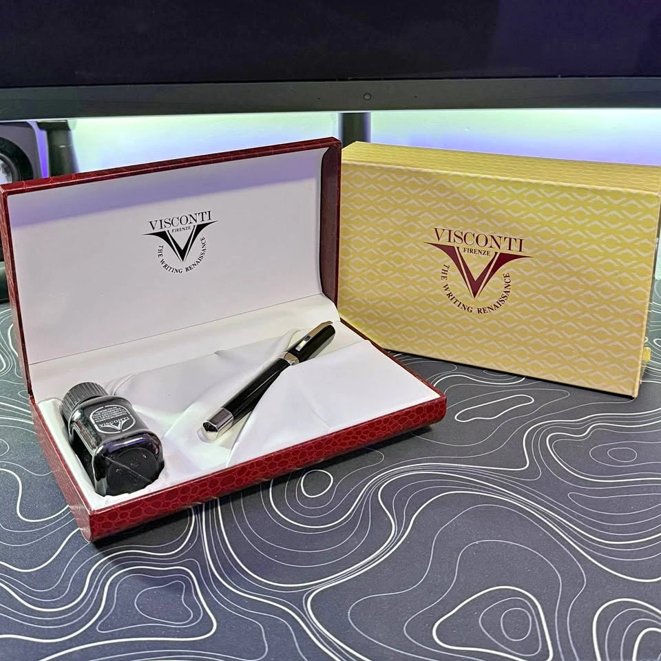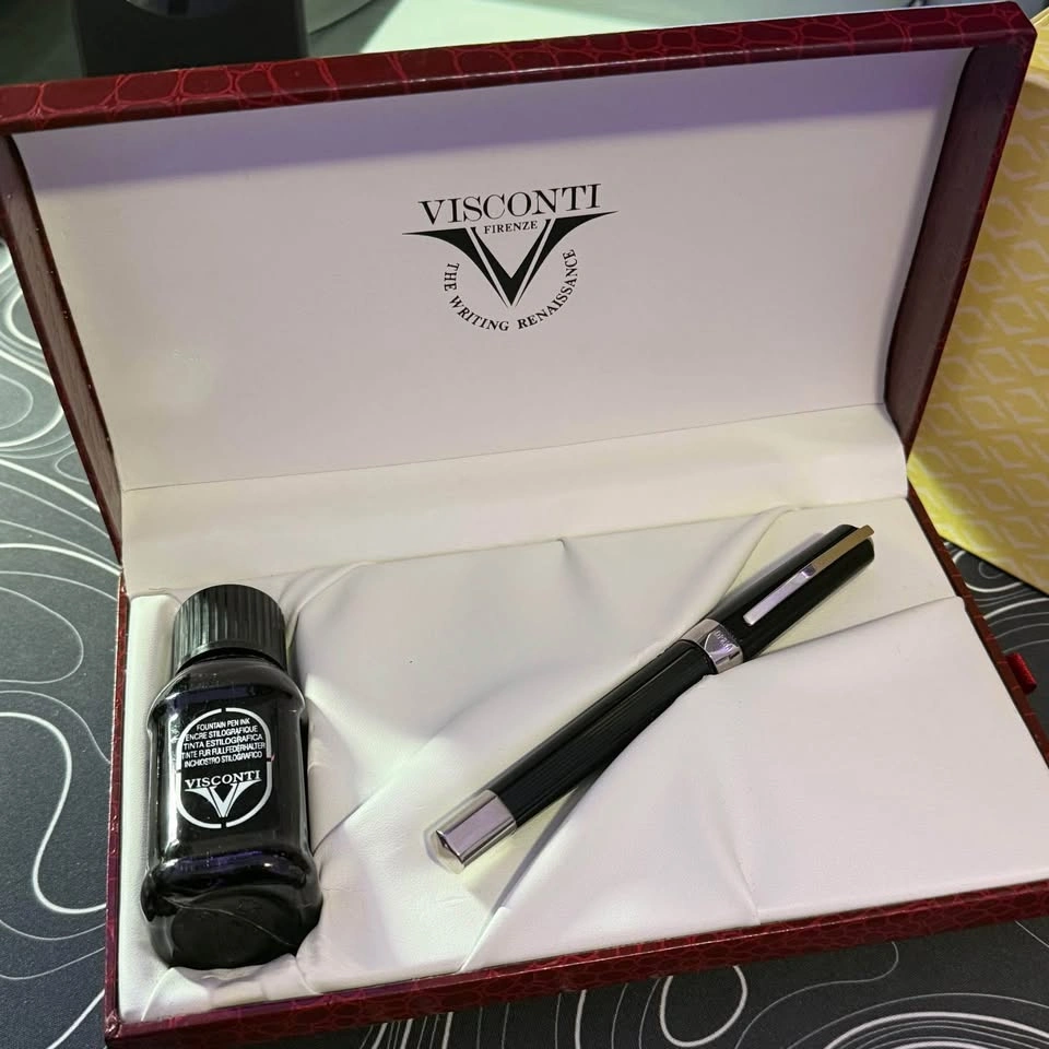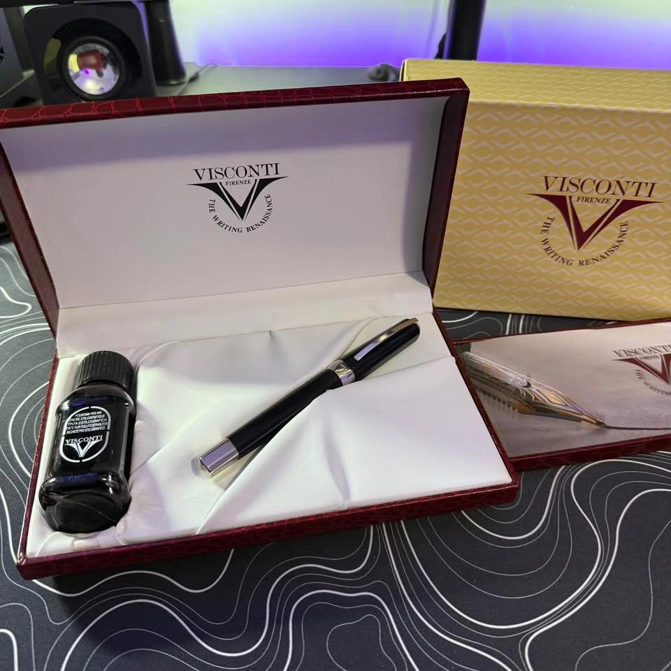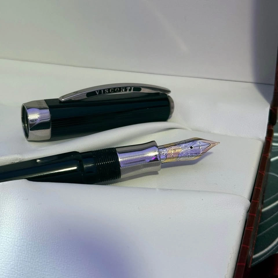 This is a beautiful Visconti Opera fountain pen in black resin with silver trim. It has a 14k (585) two-tone “M” gold nib. This pen was originally purchased from a vender at the Scriptus Pen Show in Toronto in November of last year, and has been very lightly used since then. The pen is in excellent condition and uses a cartridge/converter filling system. Comes as the full set including the original ink which can be seen in the pictures. **This price is Beale half of what I paid at the show looking to get some quick cash hence the price** Cash only and pick up only.