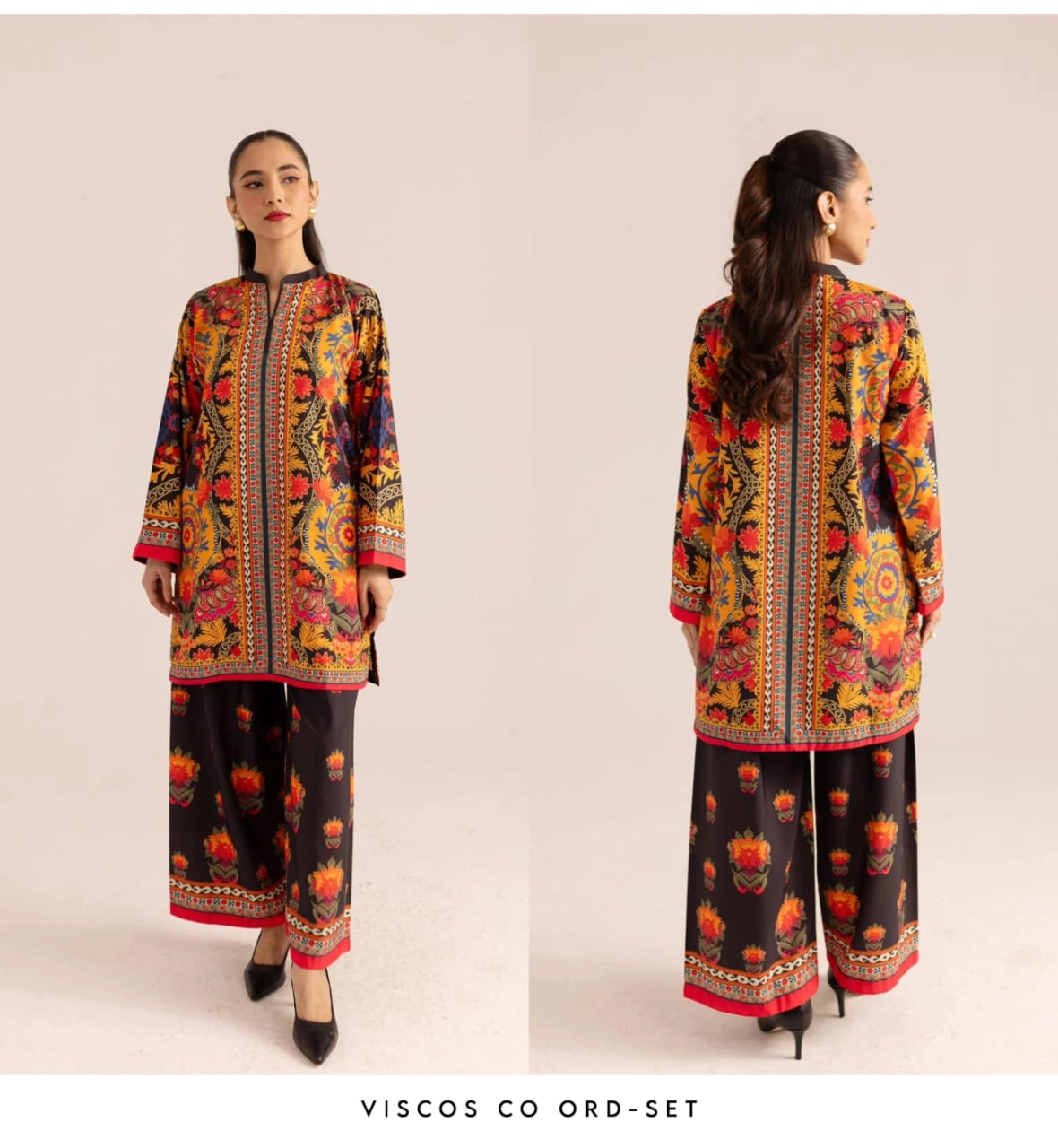 This is a Viscos Co Ord-Set. The set features a vibrant and intricate design, perfect for adding a pop of colour to your wardrobe. It's a stylish and comfortable outfit!