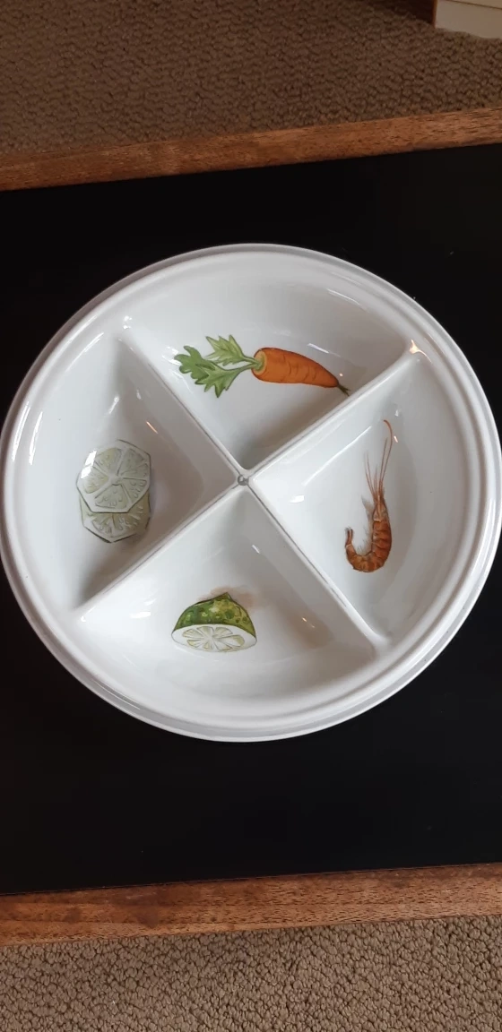 Lovely porcelain dish by Vista Alegre of Portugal Each of the 4 sections features a charming illustration. Perfect for serving appetizers or snacks with a touch of elegance!