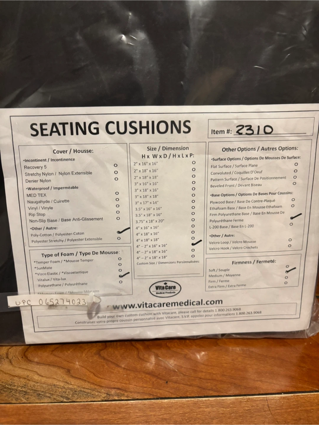 Selling a brand new VitaCare Wedge Cushion still in its original packaging! This cushion measures 4 inches by 16 inches by 16 inches and has a black cover made of poly cotton. Originally bought for $69.99 at Shoppers. Perfect for providing support and comfort while sitting