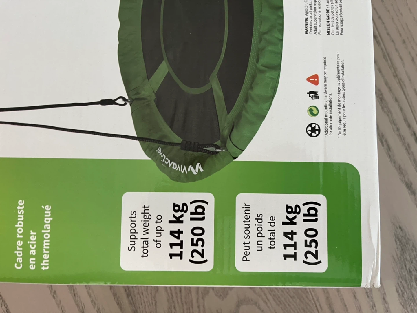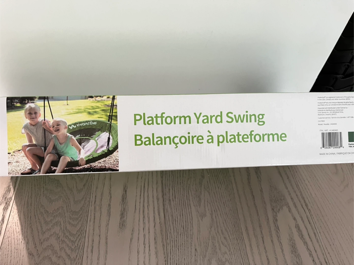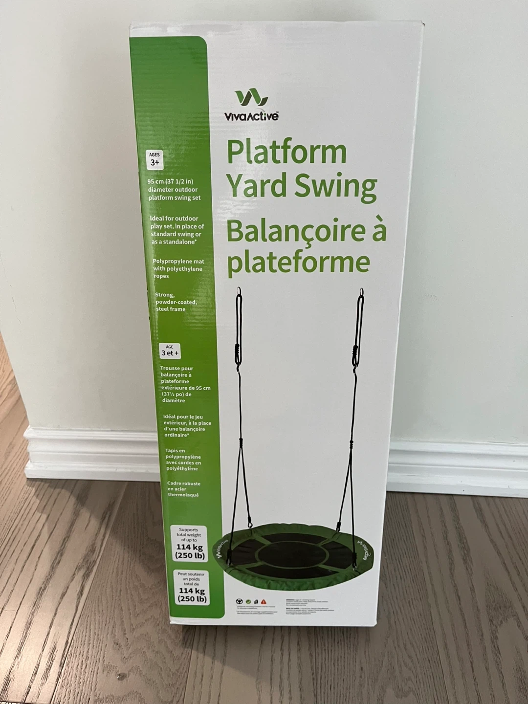 Get ready for some outdoor fun with this Viva Active Platform Yard Swing! It's brand new in the box and ready for your backyard. Perfect for kids ages 3 and up, it supports a total weight of up to 114 kg (250 lb). The swing features a strong, powder-coated steel frame and a polypropylene mat with polyethylene rope. Picked up in Markham.