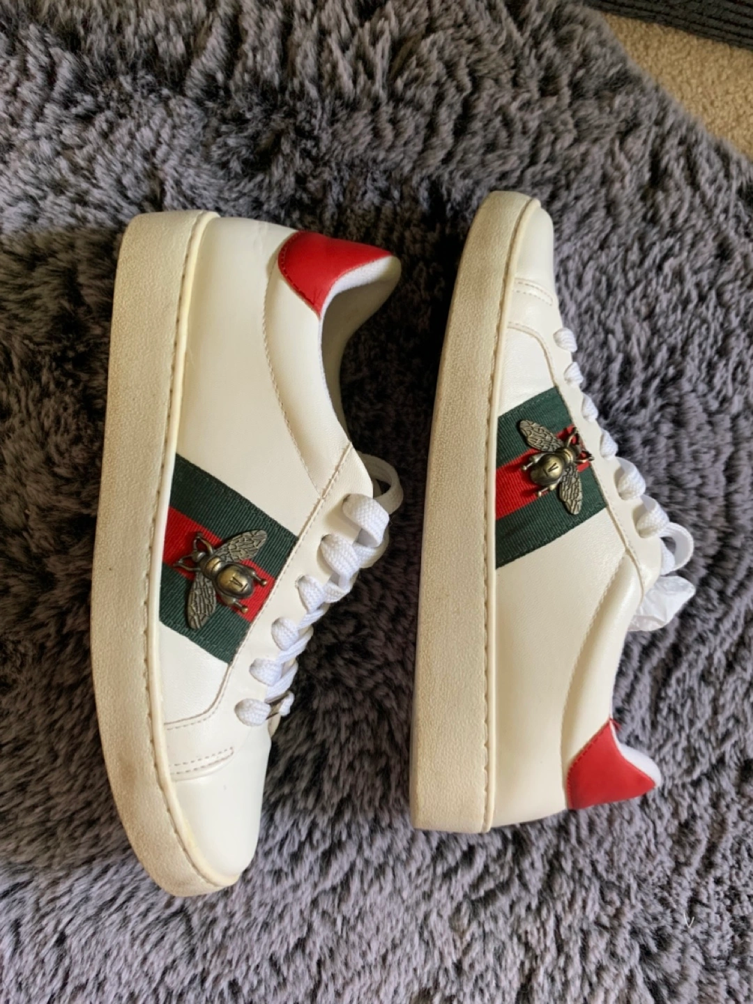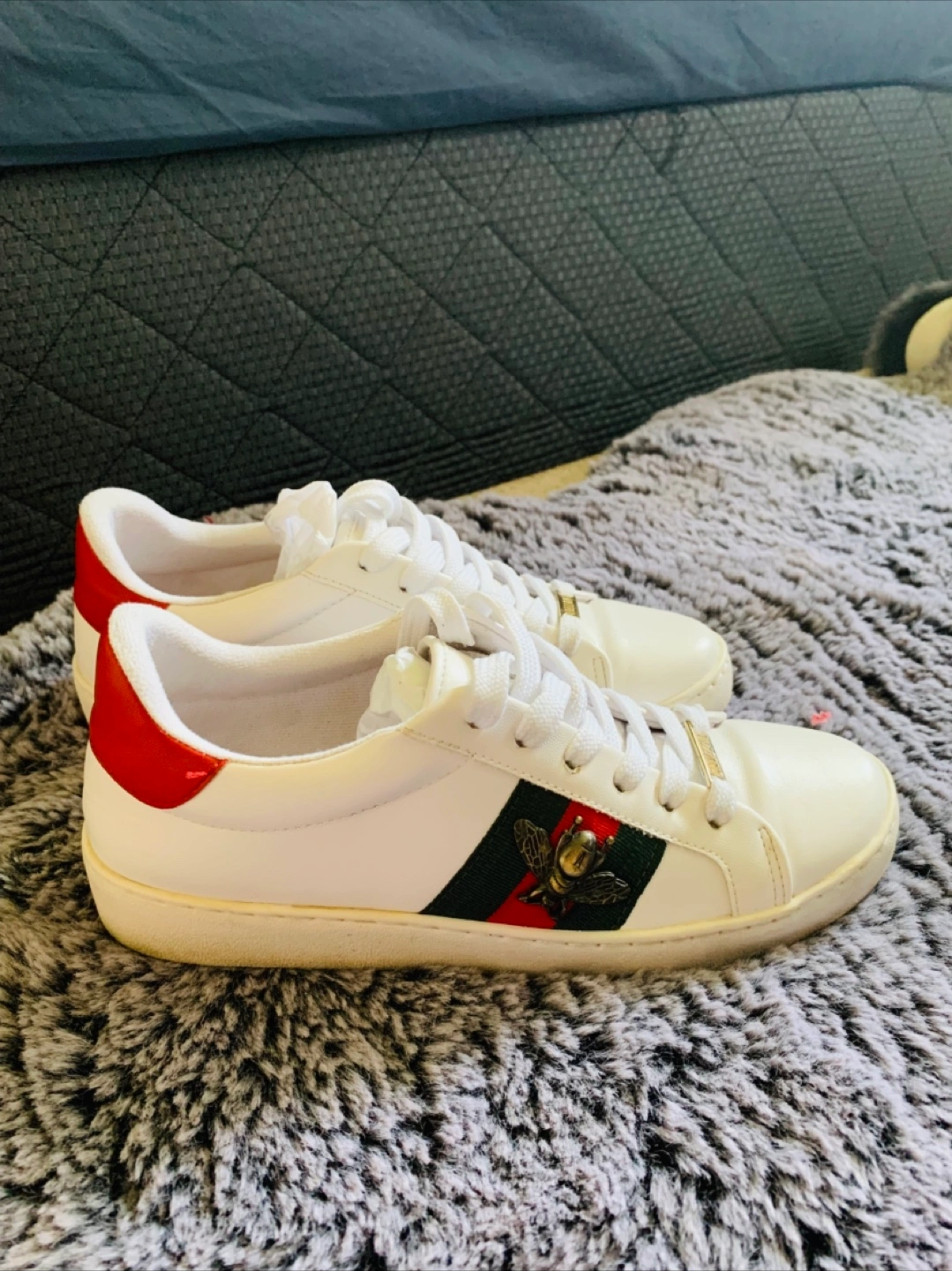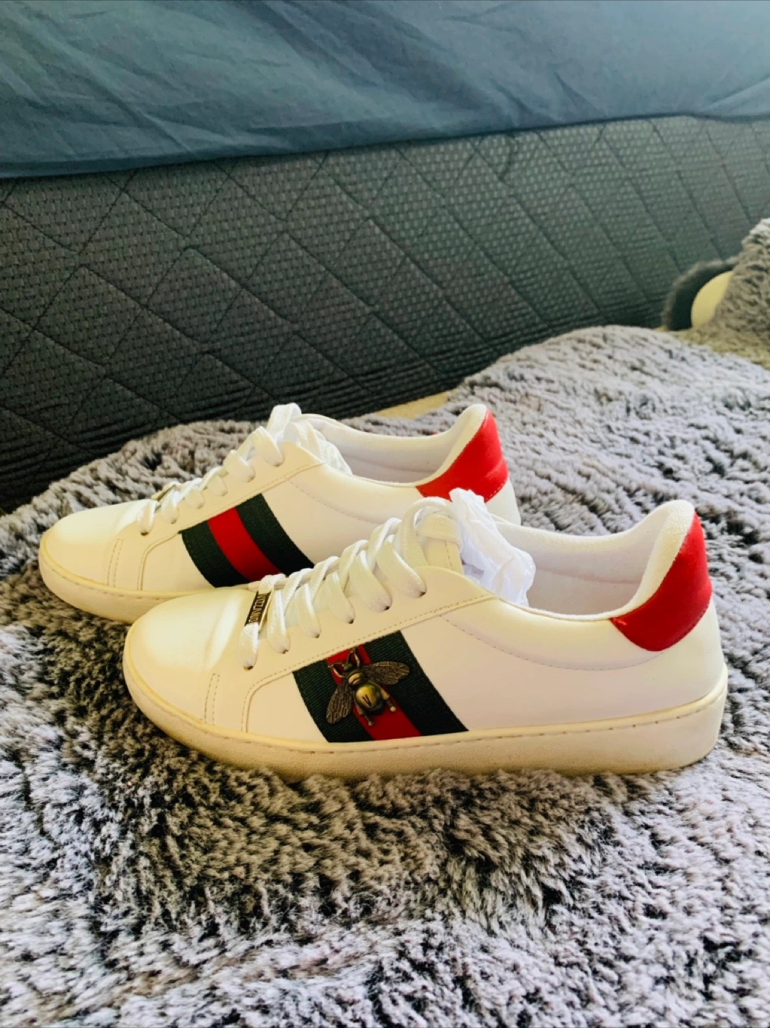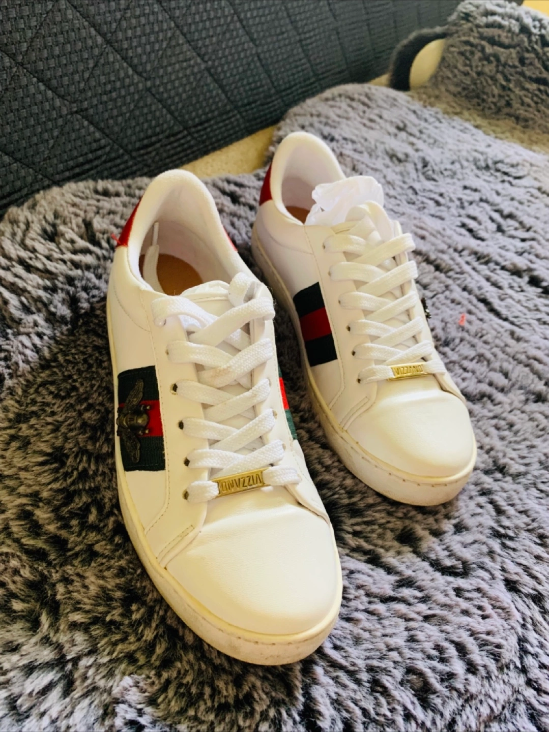 Pair of women's low-top sneakers. White leather upper. Red and green stripe detail. Gold bee emblem. Lace-up closure. Vizzano branding on the side.