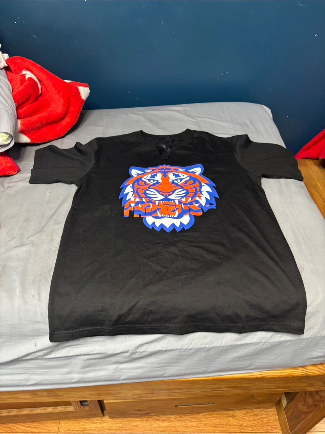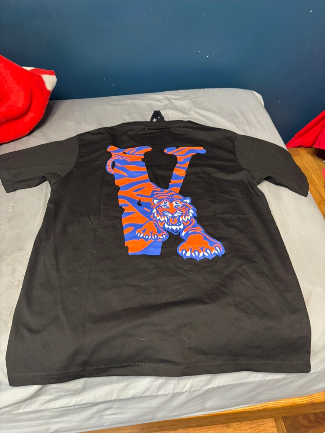 Selling a VLONE tee with a cool tiger stripe design! It's a size medium and in great condition. The shirt is black with a large tiger graphic on the front and back. Perfect for adding a bit of street style to your wardrobe!