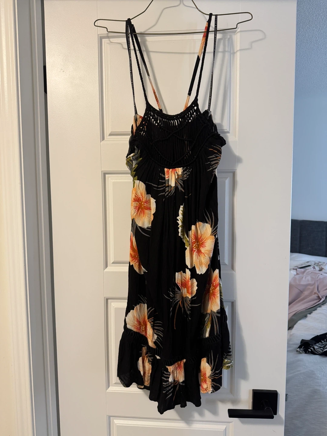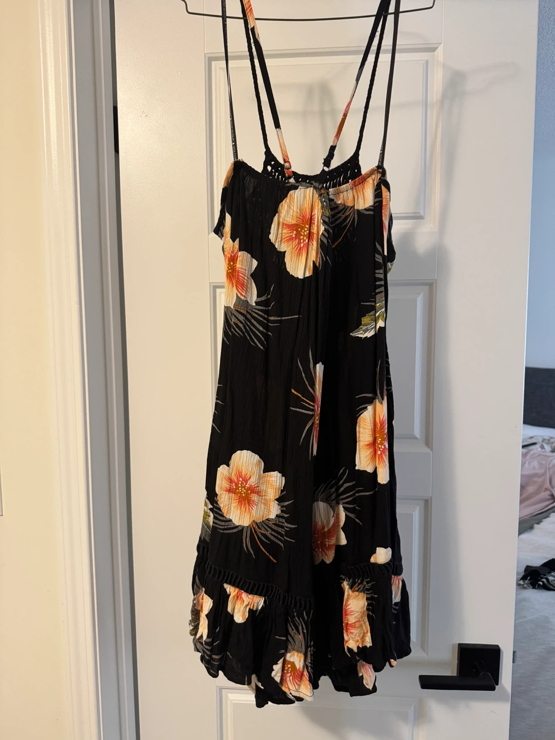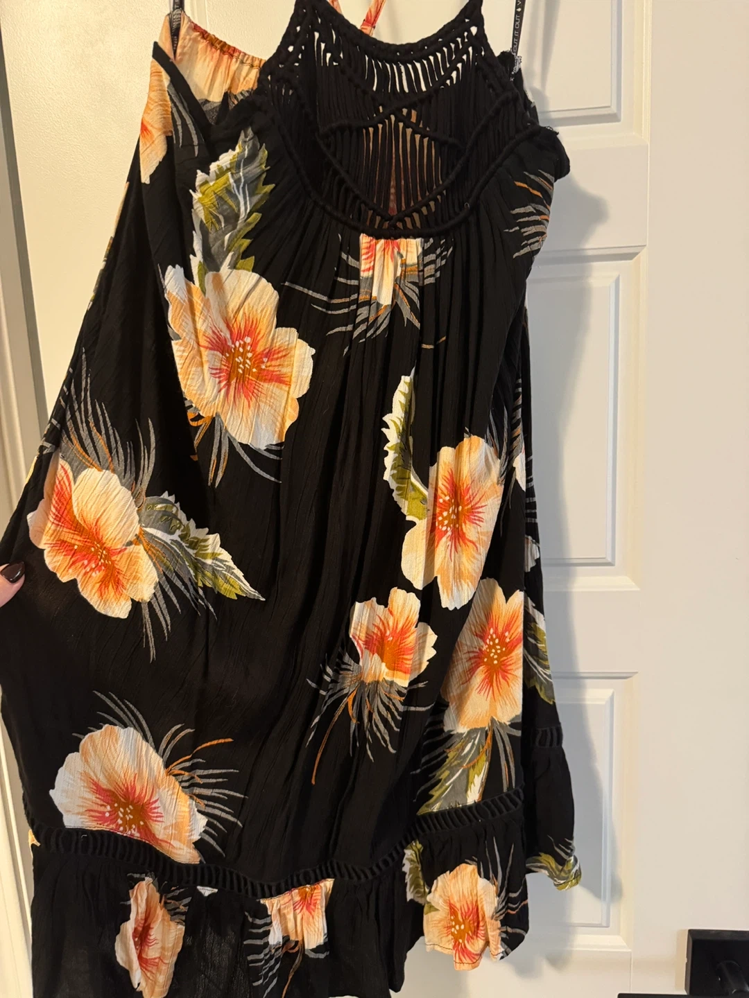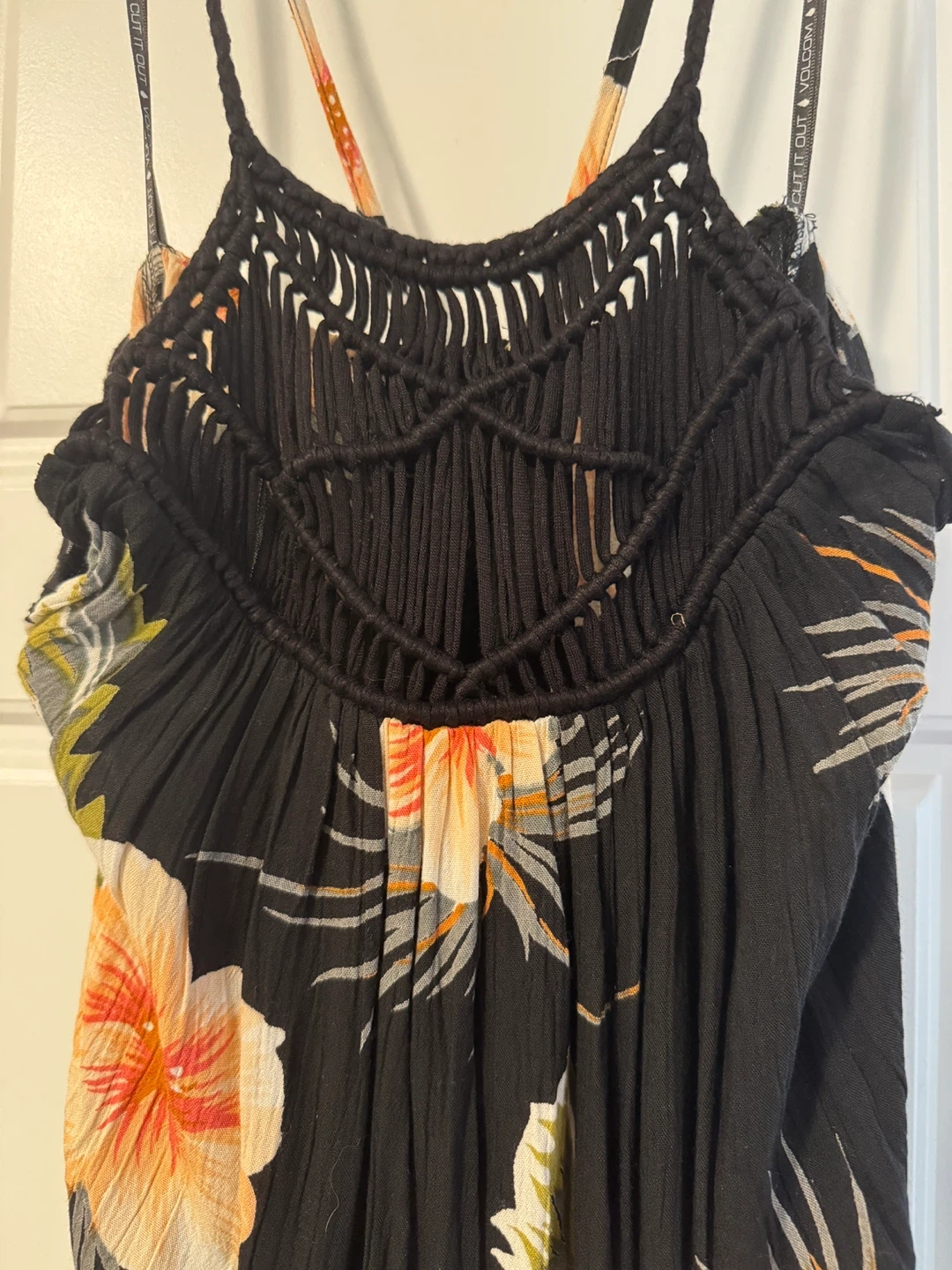 Cute Volcom dress with a black background and a vibrant floral print! It has a unique macrame detail on the back. Perfect for summer days or evenings out