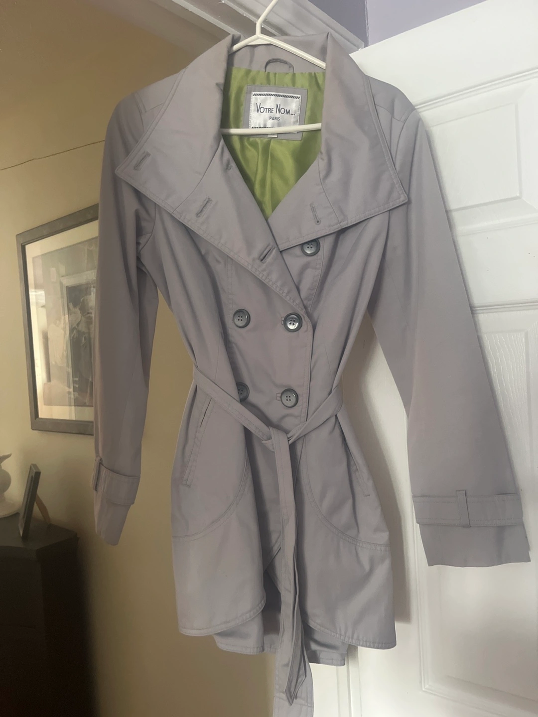 Women's grey trench coat. Double-breasted buttons. Belted waist. Pockets. Size not specified.