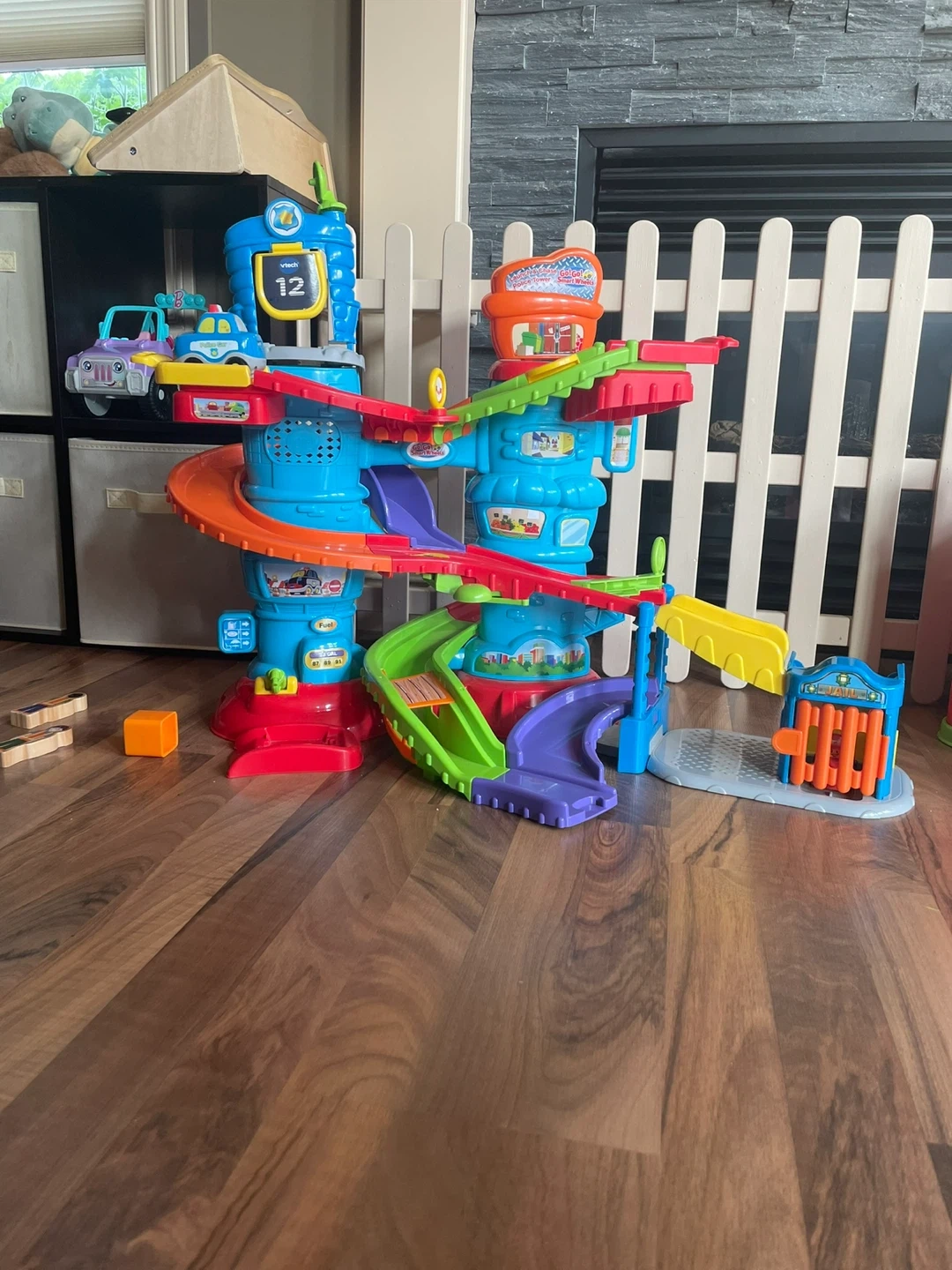 VTech Go! Go! Smart Wheels Park is ready for a new home! This interactive playset features multiple levels, ramps, and a variety of interactive elements to keep your little one entertained. It encourages imaginative play and helps develop fine motor skills. Perfect for kids who love cars and adventure. Comes with police car and orange robber.