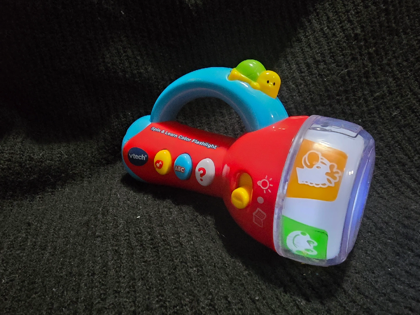 Check out this VTech Spin & Learn Color Flashlight! It's a fun and interactive toy for little ones. The flashlight features different music, colours and animals sounds , and it spins to teach colours and animals. Great for learning and playtime!