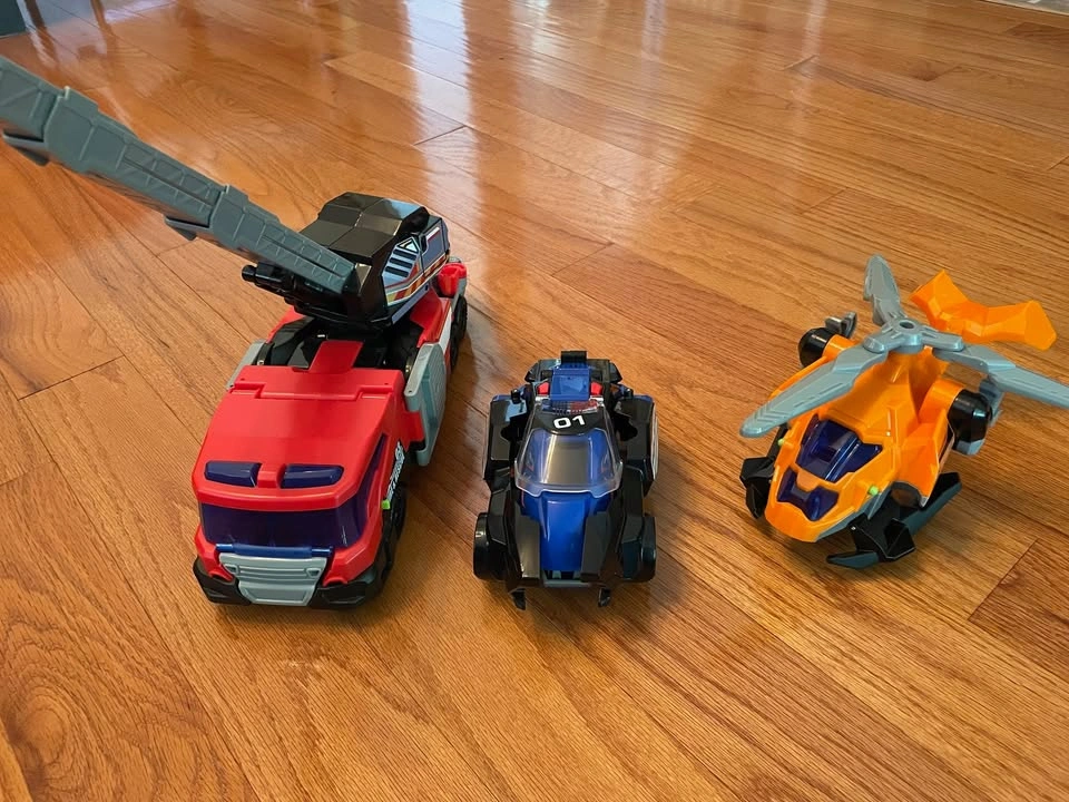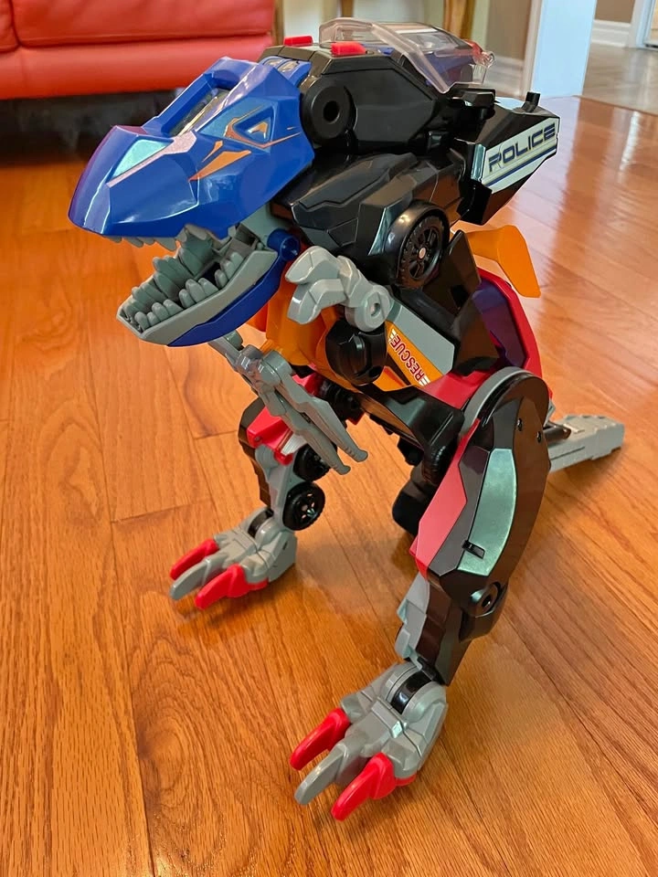 Best for ages: 4 to 8 years SCREEN Animates, talks and roars. VERY cool toy. Fly, zoom and roar with the Switch & Go® 3-in-1 Rescue Rex! Easily combine the fire truck, rescue copter and electronic police car into a roaring T-Rex over twenty inches long. • Transform playtime adventures with Switch & Go®; easily combine the fire truck, rescue helicopter and electronic police car into a 20+ inch long T-Rex with animated dino eyes • Race around with an action-packed police car with lights, phrases and an animated driver • Rotate and extend the ladder on the fire truck and spin the propeller on the helicopter to amp up imagination • Cool action sounds, phrases and digital effects encourage play and adventure with transforming action figures Like new. Works perfectly.