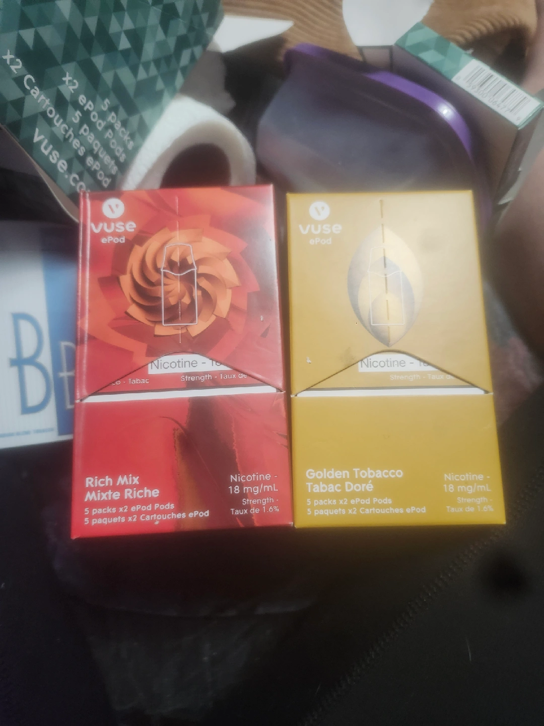 Selling two packs of Vuse ePod cartridges! One is Rich Mix and the other is Golden Tobacco. Each pack contains 5 pods with 18mg/mL nicotine strength. Perfect if you're looking to stock up!