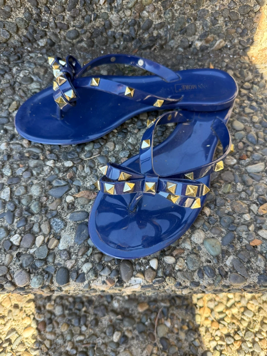 Cute blue thong sandals from VY MORE! These have gold-tone pyramid studs on the straps and a small bow detail. Size 38 but fit small.