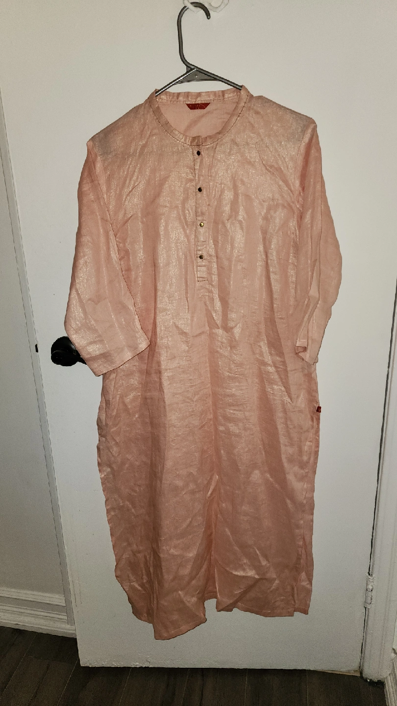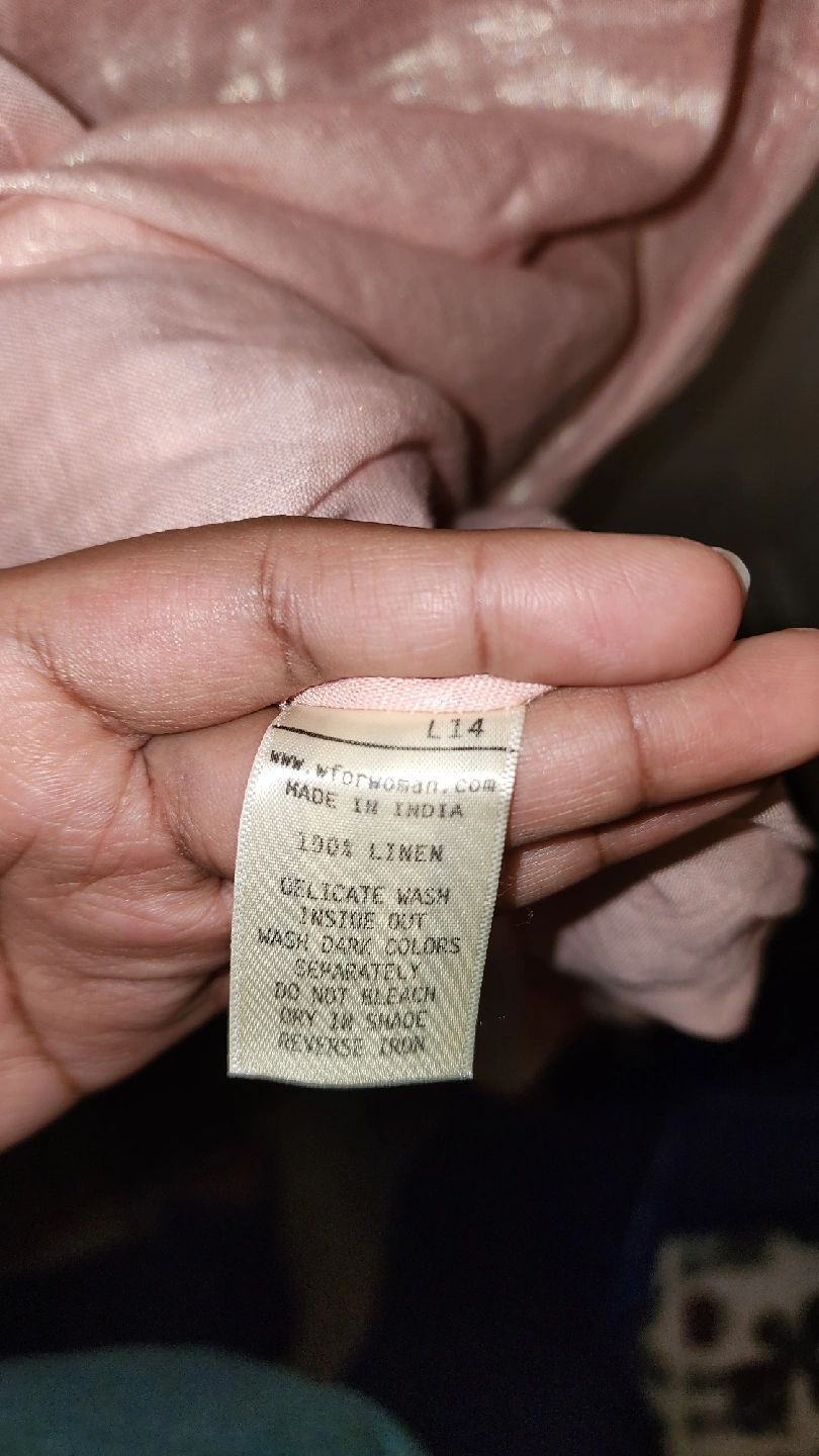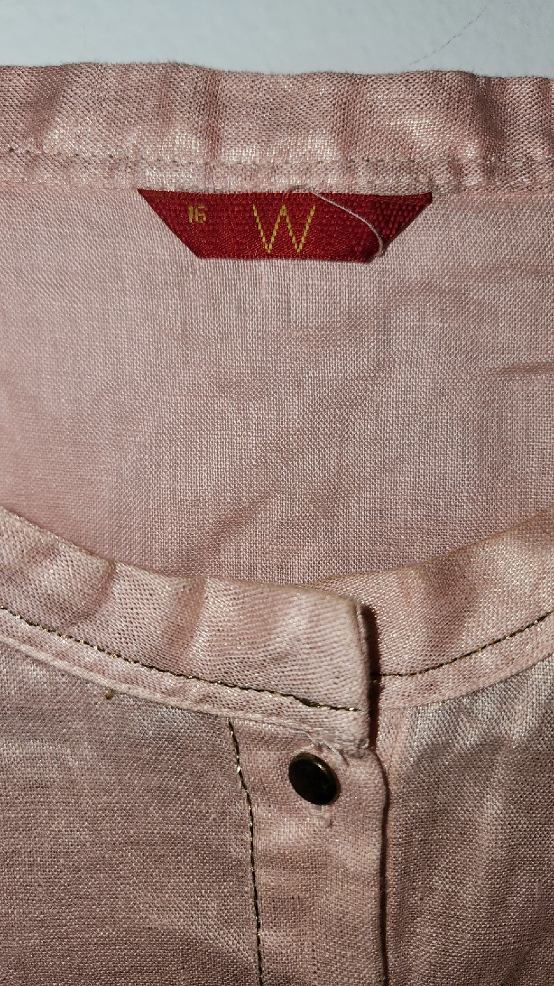 Selling a stylish linen pink tunic from W! It's a size 16 and features a unique button-down design. The material has a subtle shimmer, making it perfect for dressing up or down.