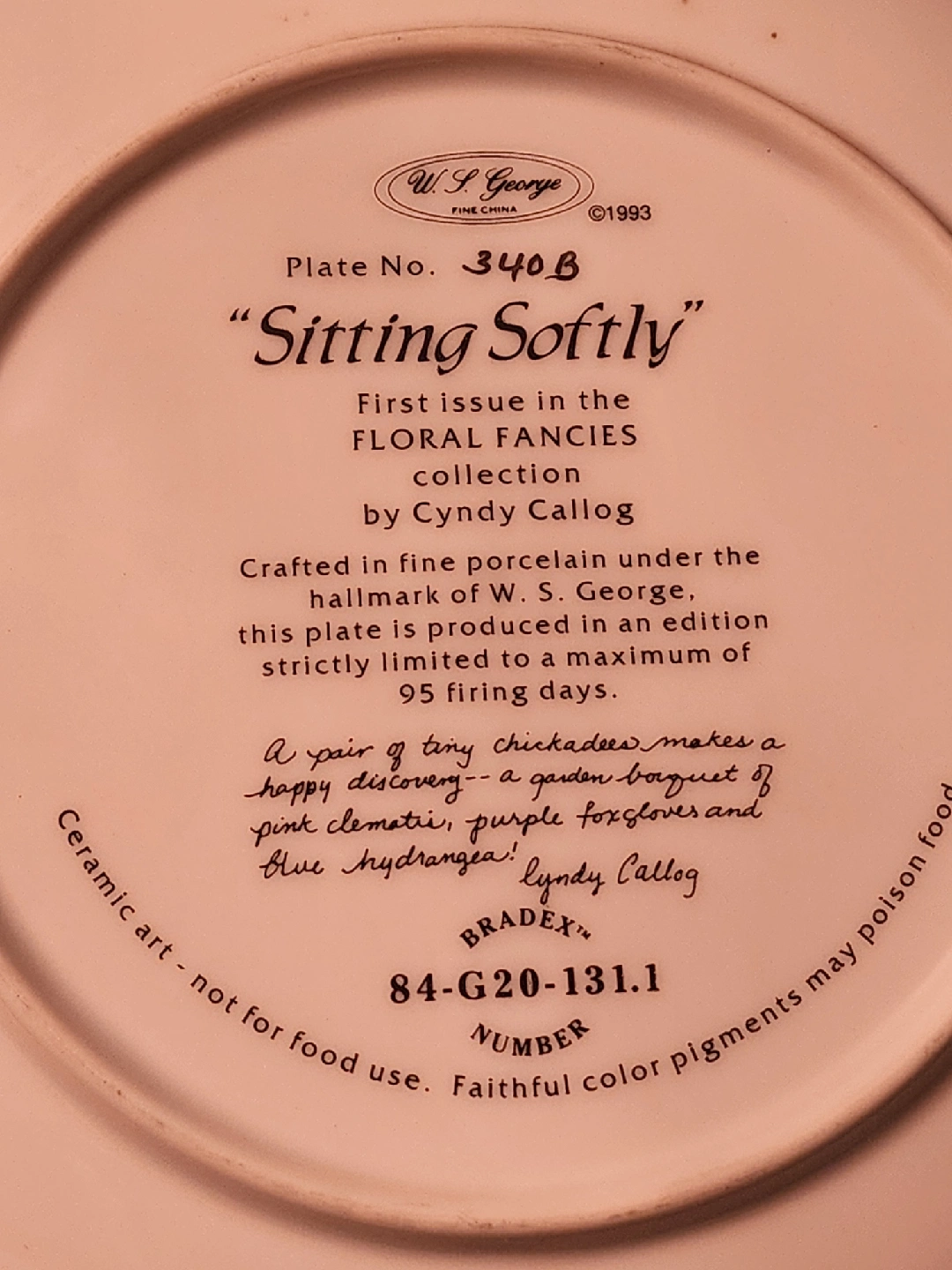 Selling a W.S. George fine china plate titled "Sitting Softly" from the Floral Fancies collection. This is plate number 340B and it's the first issue in the collection. It's crafted in fine porcelain under the hallmark of W. S. George and produced in an edition strictly limited to a maximum of 95 firing days.