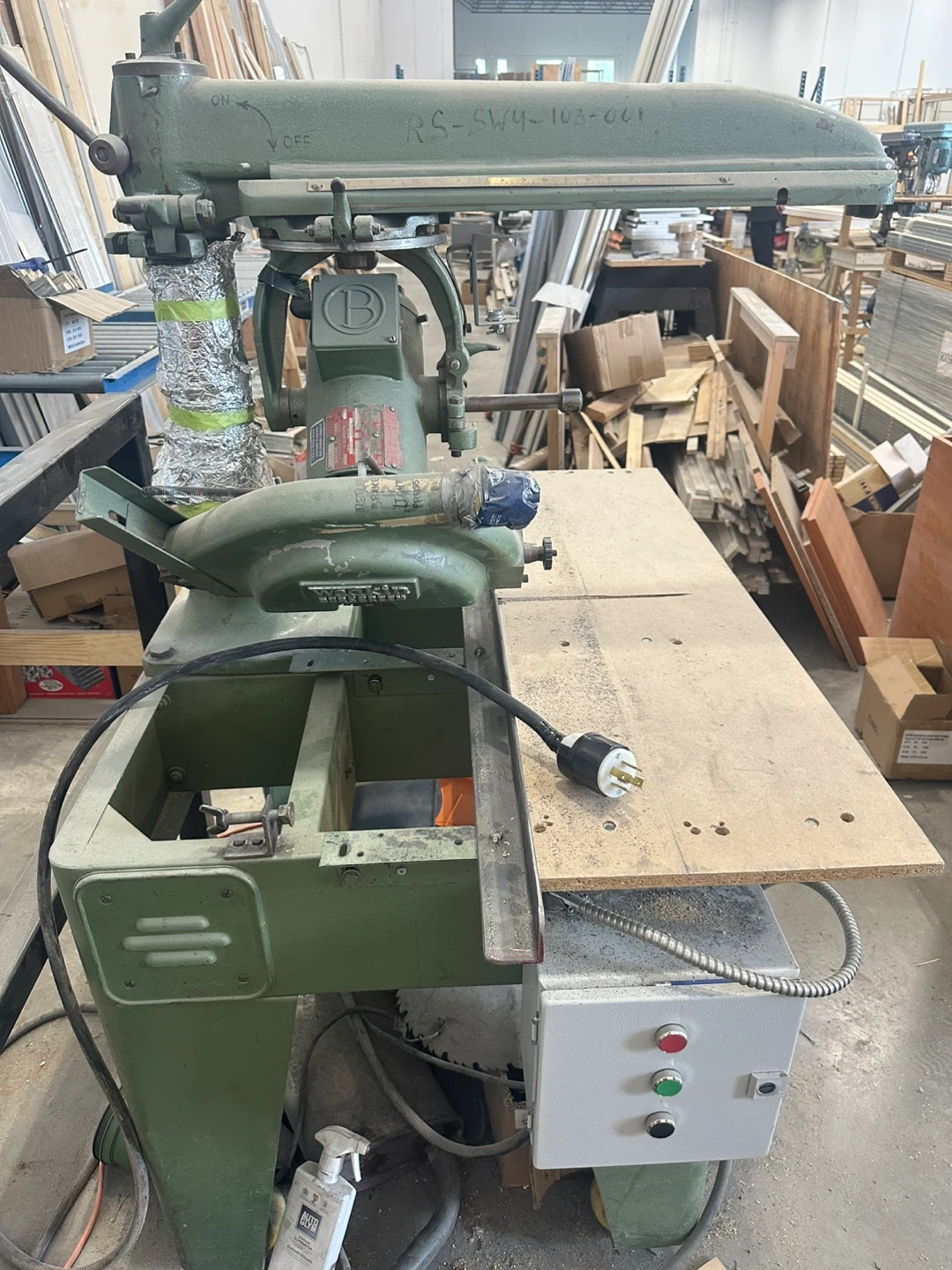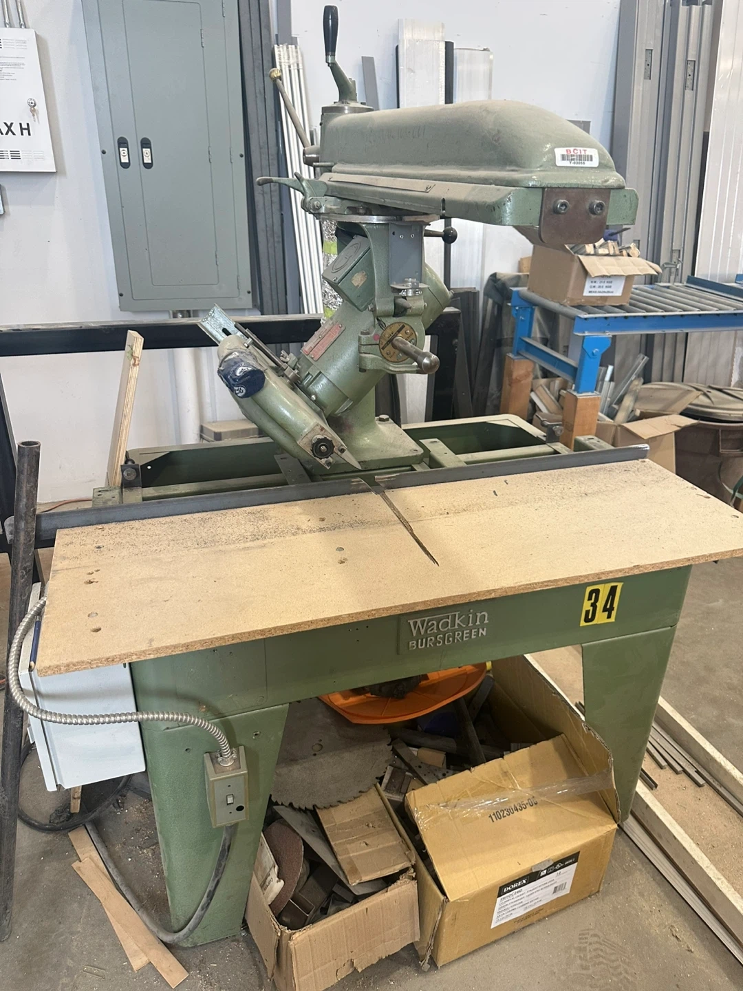 Selling a Wadkin Bursgreen radial arm saw. It appears to be in good working condition. Please see photos for details