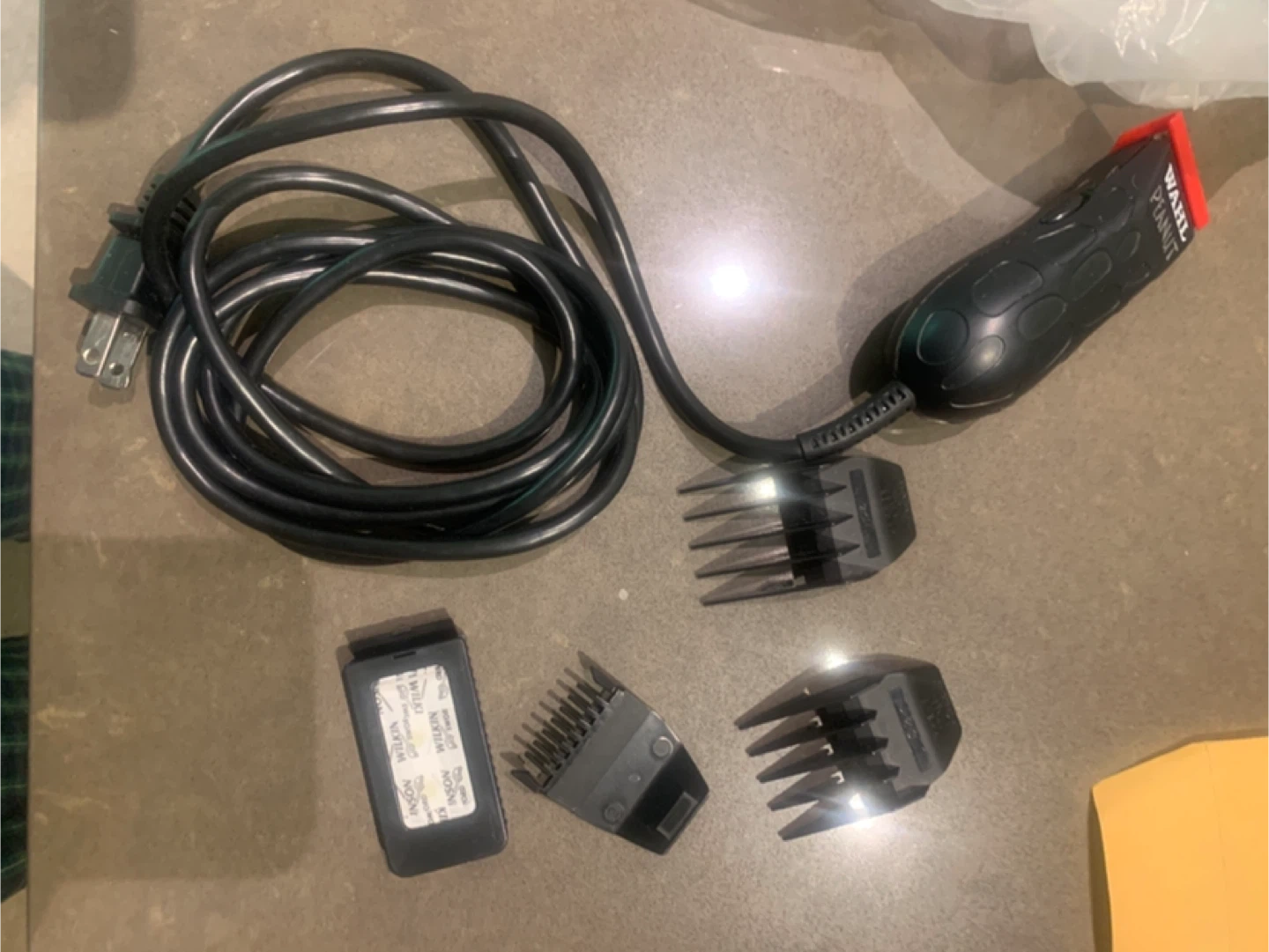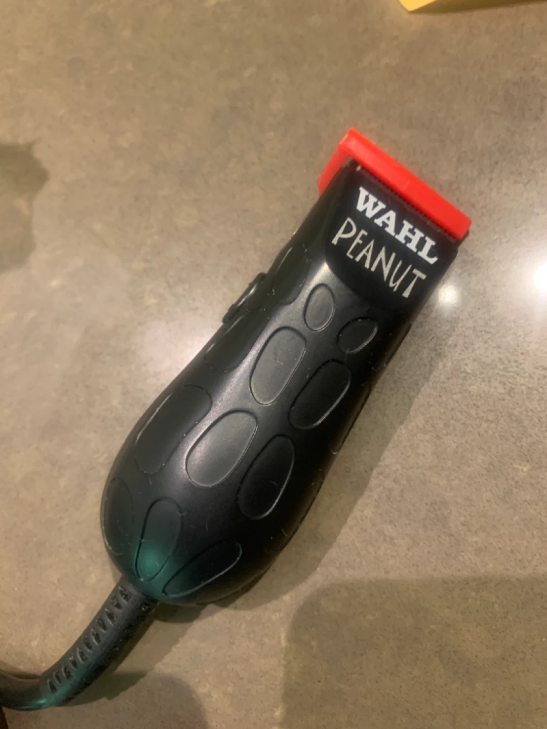 Selling a Wahl Peanut hair clipper in black. It comes with the clipper, power cord, and several attachment combs. Great for quick trims and touch-ups!