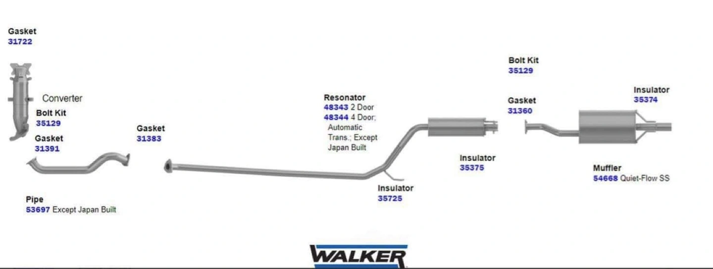 Walker exhaust system, includes resonator, muffler, pipe, and all associated gaskets and bolts. Built for vehicles with automatic transmission and manual. For 2010 Honda civic.