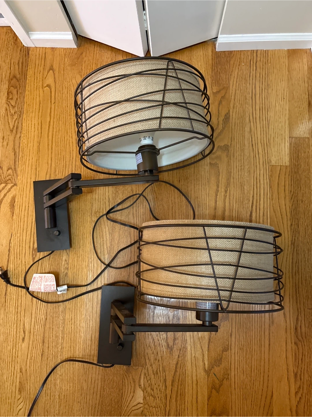 Selling a set of two wall lamps! They feature a unique wire cage design with a neutral-toned shade. Perfect for adding a touch of industrial style to any room. Lights are plug in.